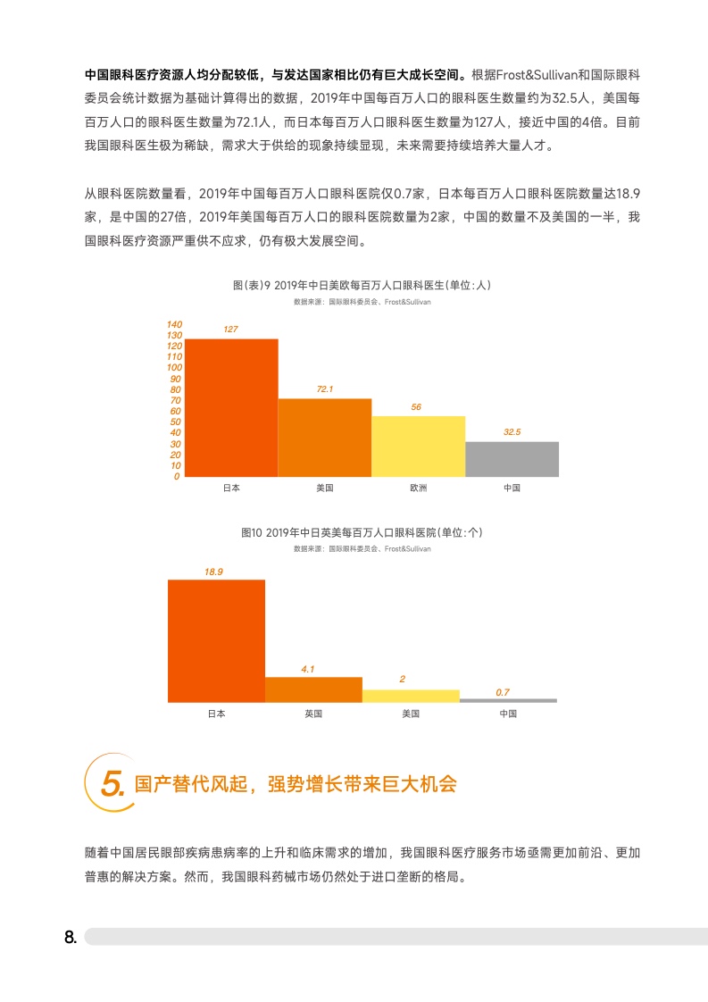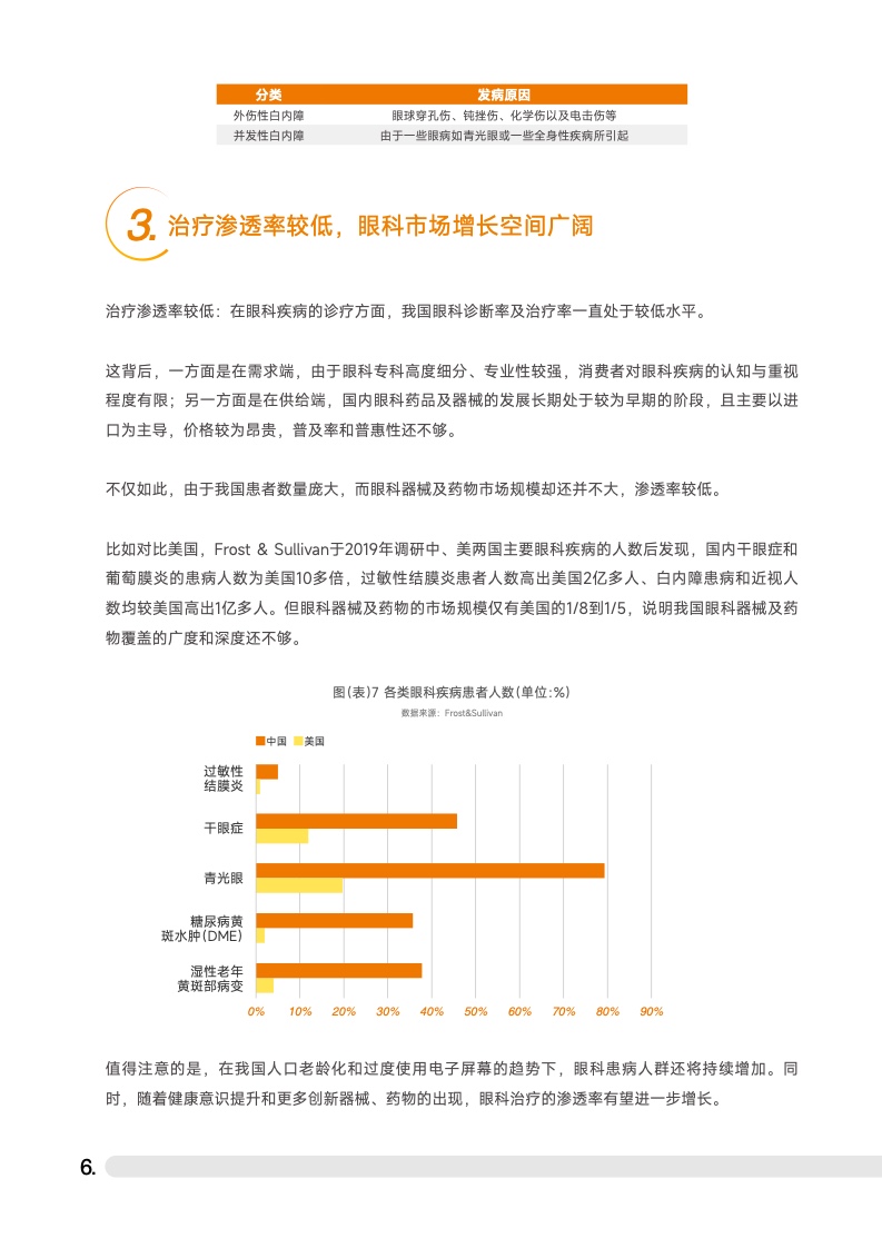 比如对比美国,Frost & Sullivan于2019年调研中、美两国主要眼科疾病的人数后发现,国内干眼症和葡萄膜炎的患病人数为美国10多倍,过敏性结膜炎患者人数高出美国2亿多人、白内障患病和近视人数均较美国高出1亿多人。但眼科器械及药物的市场规模仅有美国的1/8到1/5,说明我国眼科器械及药物覆盖的广度和深度还不够。