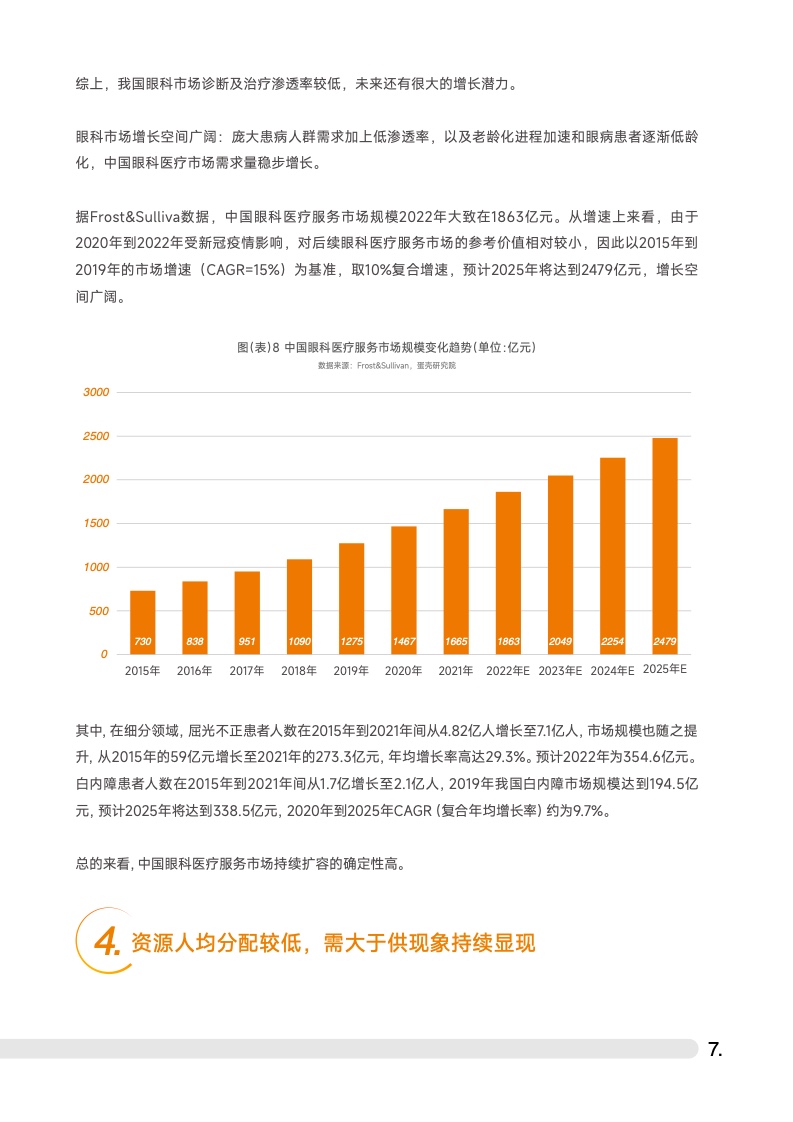 据Frost&Sulliva数据,中国眼科医疗服务市场规模2022年大致在1863亿元。从增速上来看,由于2020年到2022年受新冠疫情影响,对后续眼科医疗服务市场的参考价值相对较小,因此以2015年到2019年的市场增速(CAGR=15%)为基准,取10%复合增速,预计2025年将达到2479亿元,增长空间广阔。