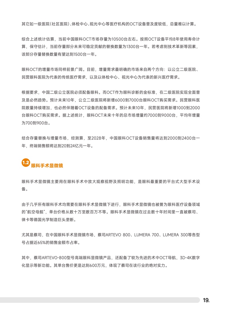 在未来,眼科OCT市场规模由存量替换及新增购买两份组成。结合存量替换与增量市场,经测算,至2028年,中国眼科OCT设备销售量将达到2000到2400台一年,终端销售额将达到20到24亿元一年。