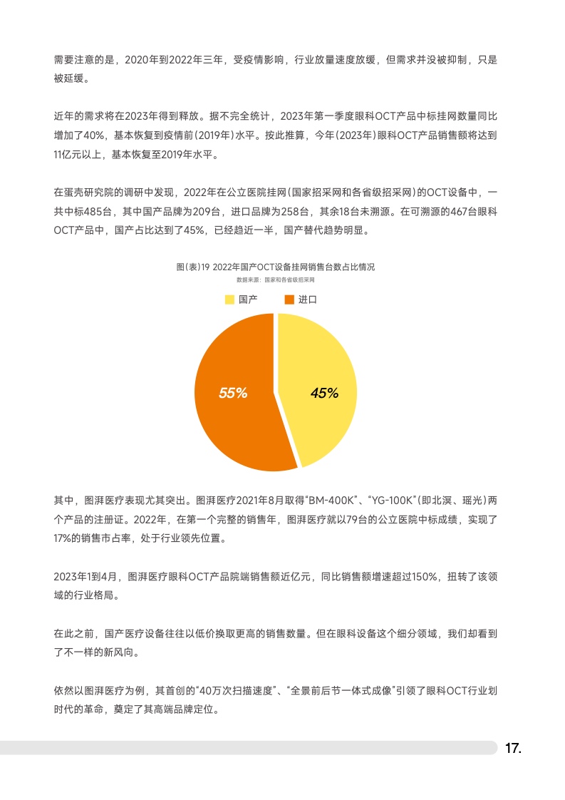 其中,图湃医疗表现尤其突出。图湃医疗2021年8月取得“BM-400K”、“YG-100K”﹙即北溟、瑶光﹚两个产品的注册证。2022年,在第一个完整的销售年,图湃医疗就以79台的公立医院中标成绩,实现了17%的销售市占率,处于行业领先位置。2023年1到4月,图湃医疗眼科OCT产品院端销售额近亿元,同比销售额增速超过150%,扭转了该领域的行业格局。
