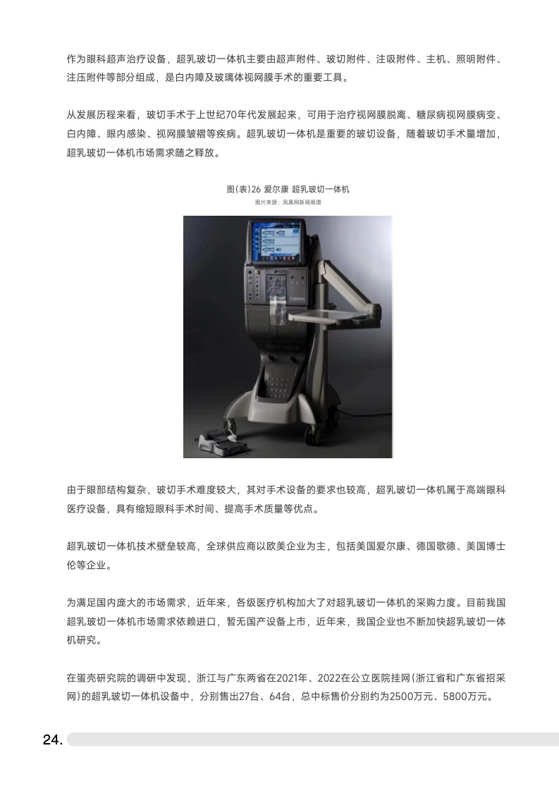 从发展历程来看,玻切手术于上世纪70年代发展起来,可用于治疗视网膜脱离、糖尿病视网膜病变、白内障、眼内感染、视网膜皱褶等疾病。超乳玻切一体机是重要的玻切设备,随着玻切手术量增加,超乳玻切一体机市场需求随之释放。