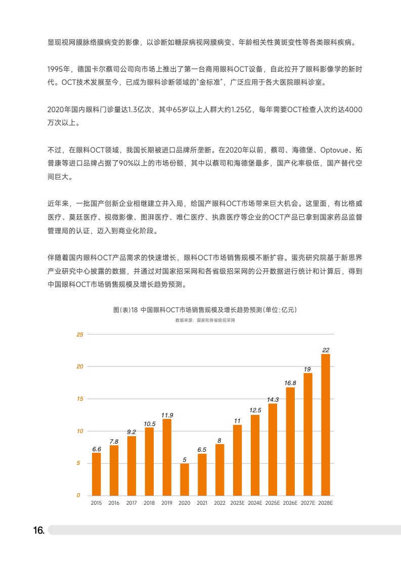 伴随着国内眼科OCT产品需求的快速增长,眼科OCT市场销售规模不断扩容。蛋壳研究院基于新思界产业研究中心披露的数据,并通过对国家招采网和各省级招采网的公开数据进行统计和计算后,得到中国眼科OCT市场销售规模及增长趋势预测。