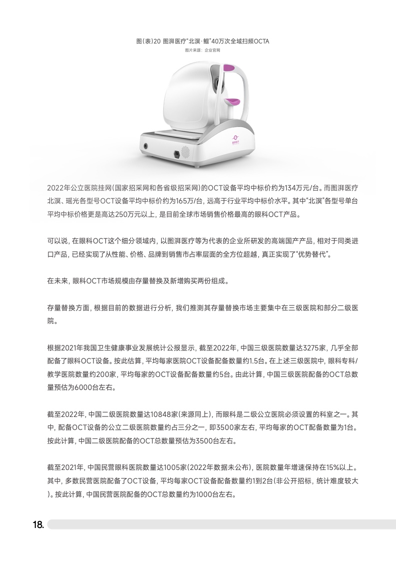 近年的需求将在2023年得到释放。据不完全统计,2023年第一季度眼科OCT产品中标挂网数量同比增加了40%,基本恢复到疫情前﹙2019年﹚水平。按此推算,今年﹙2023年﹚眼科OCT产品销售额将达到11亿元以上,基本恢复至2019年水平。