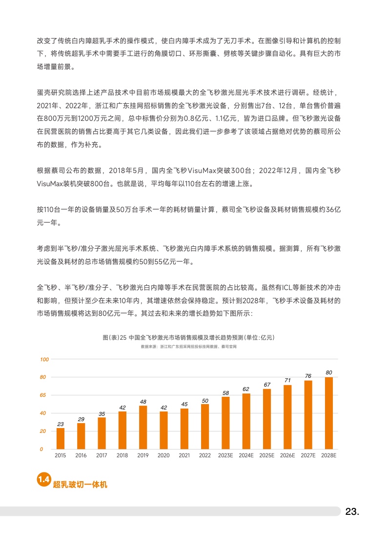 而玻切手术的耗材需求基本与其手术量相同,约20到30万套一年。据此估算,2022年中国超乳玻切一体机设备及耗材的销售规模约11亿元。预计到2028年,该产品年市场销售规模将达到20亿元一年。