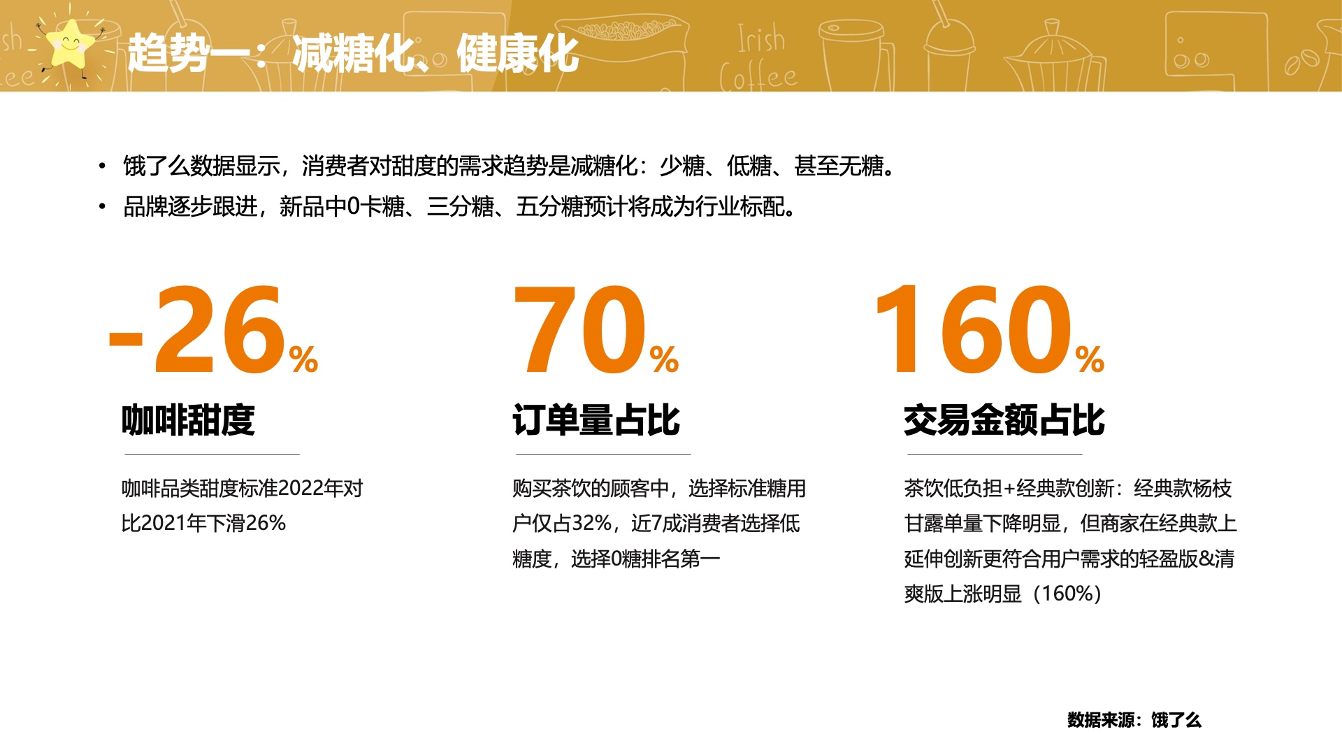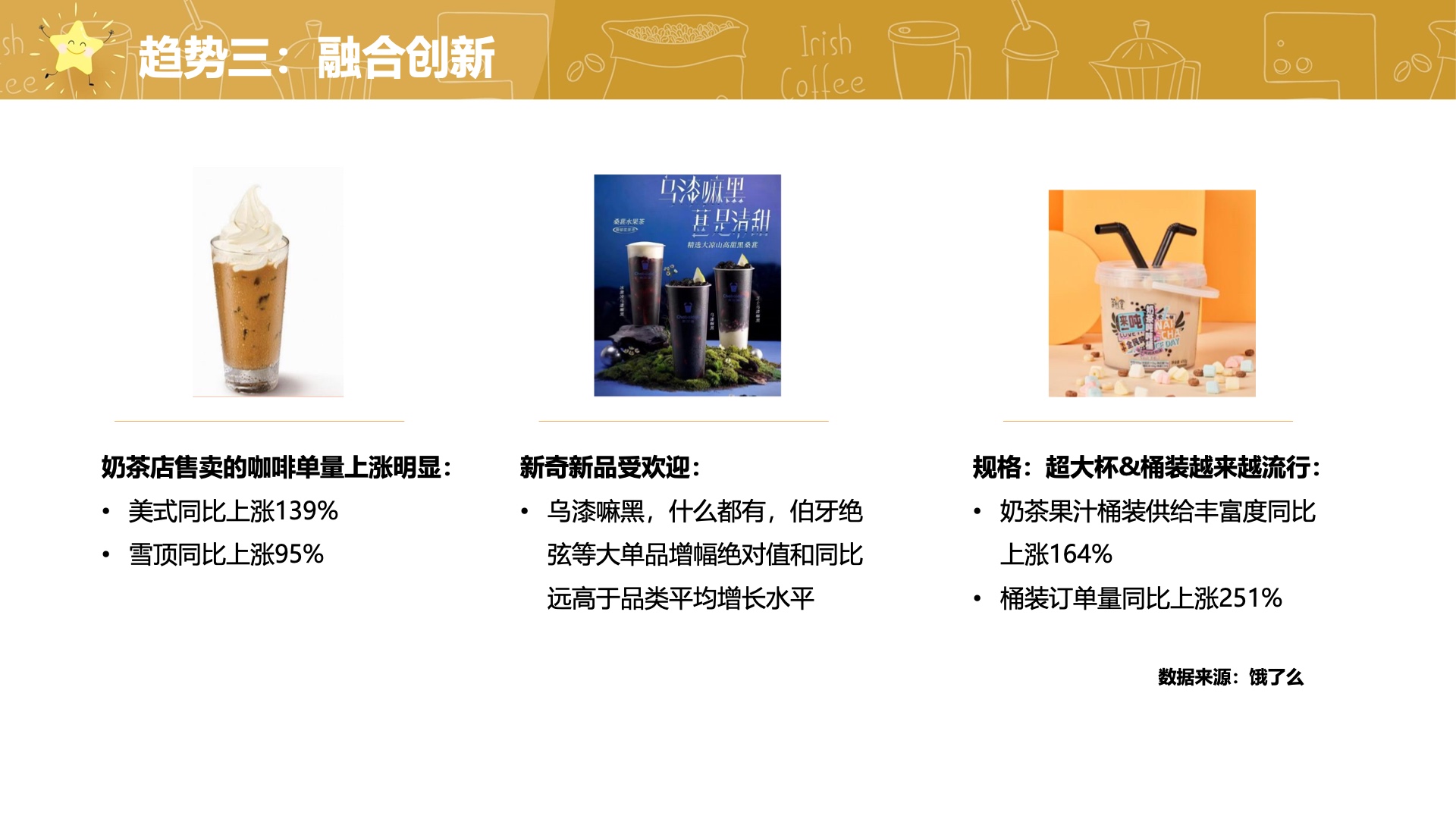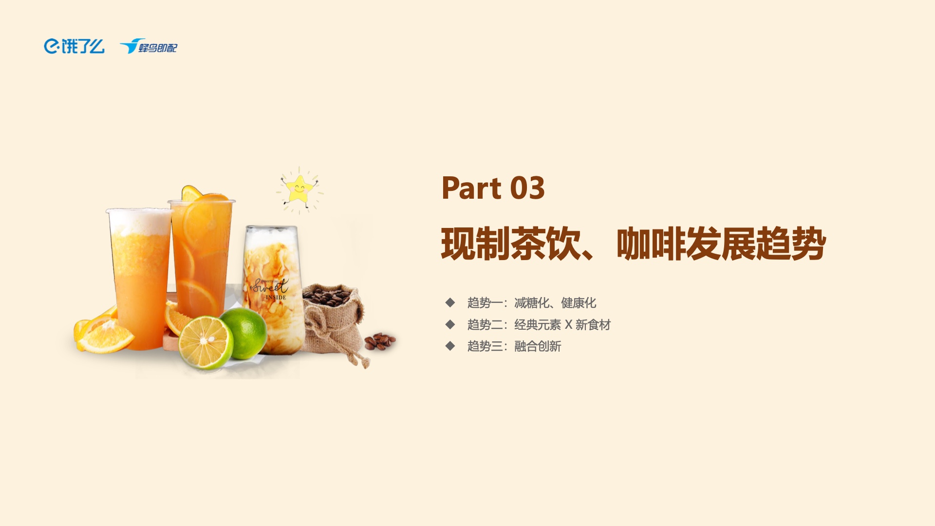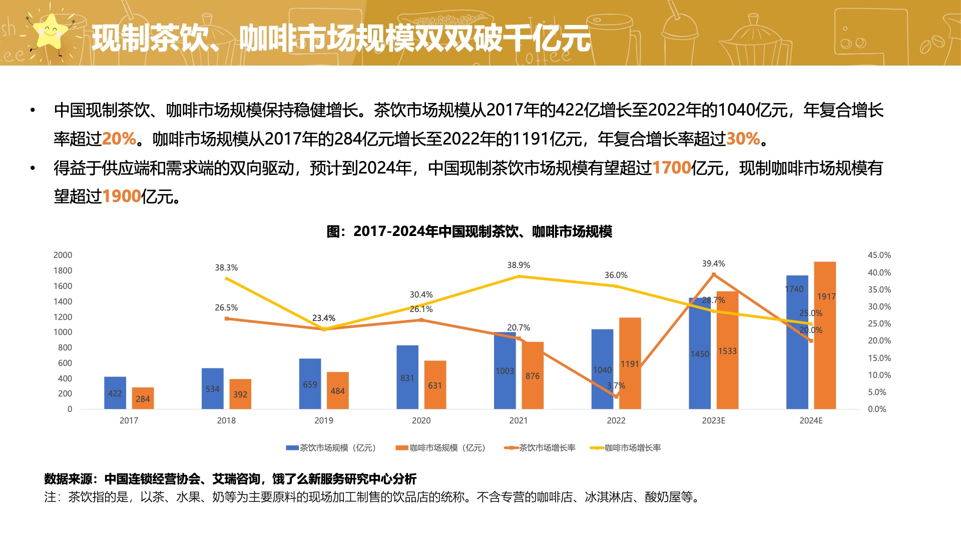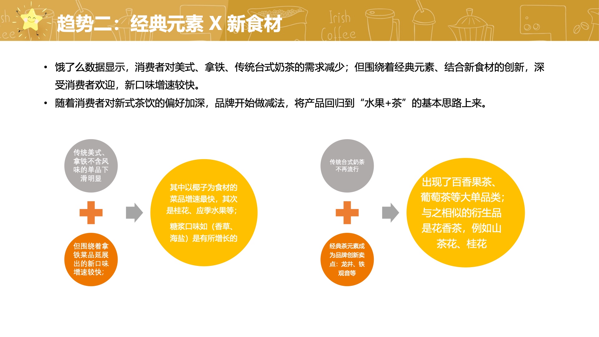 报告对现制茶饮和咖啡行业的未来趋势作了预判。一方面,减糖化和健康化成为了消费者最为关注的需求趋势,品牌将逐步跟进。另一方面,经典元素和新食材将结合,创新茶饮口味将继续推出,以满足新一代消费者对健康、美味和新鲜的需求。品牌将逐渐回归到“水果+茶”的基本思路上来,追求更加健康和天然的茶饮产品。