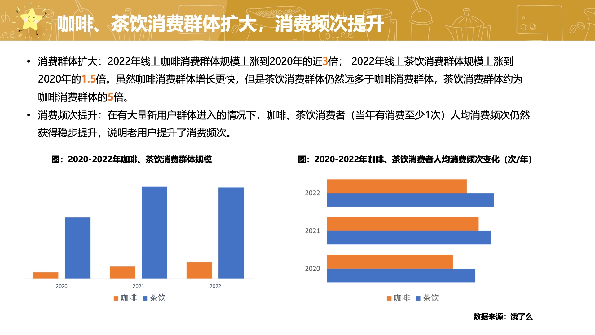 报告显示,茶饮和咖啡市场都呈现出快速增长的趋势,在线上消费领域的复合增速分别达到30%和60%,其中订单规模方面,茶饮是咖啡的6倍多,消费规模方面,茶饮是咖啡的4倍多。