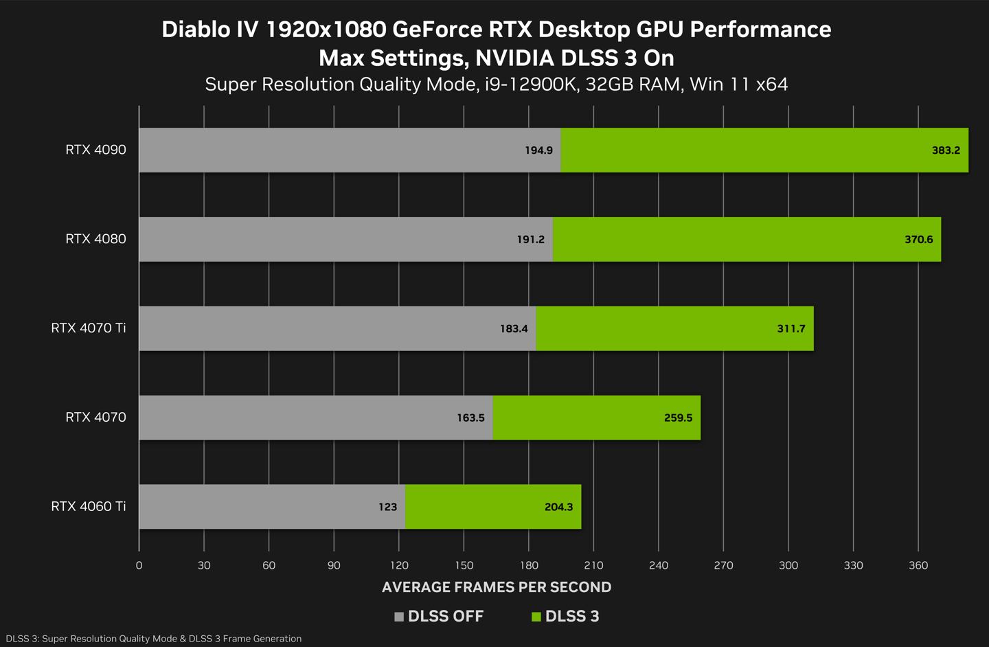根据英伟达的数据,最新驱动下,RTX 4090 运行 4K 最高画质《暗黑破坏神 4》可达 229fps,RTX 4070 也可达到了 113fps。