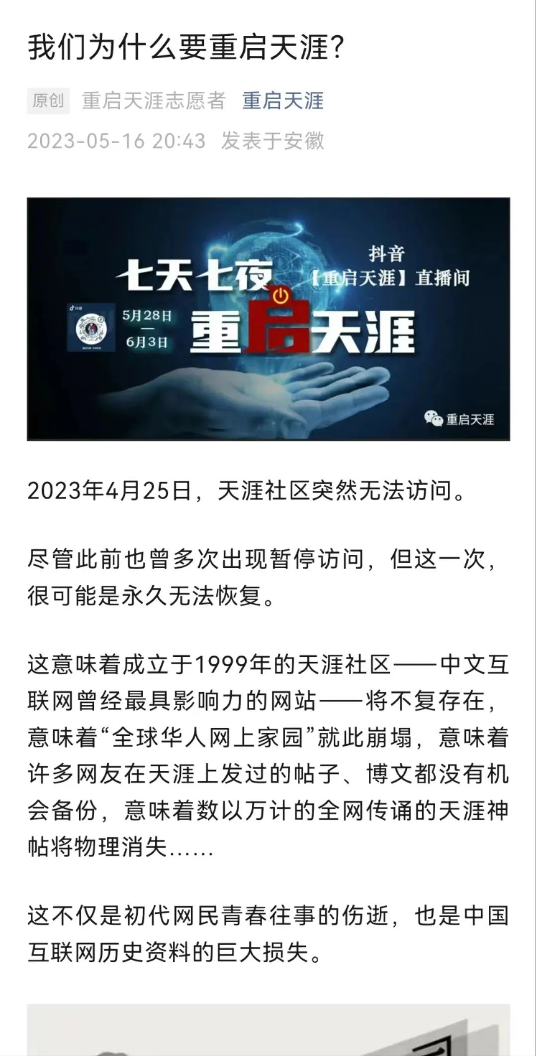 “如果一定要告别,那也应该是一种体面的方式,应该让所有用户把自己的青春记忆下载完再走”,在重启天涯行动纲领中这样写道。