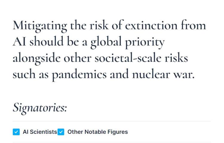 该声明指出“减轻AI(给人类)带来的灭绝风险应成为全球性的优先事项,与大流行病及核战争等其他影响社会的大规模风险同等级别”。超过 350 名从事人工智能工作的高管、研究人员和工程师签署了这份公开信。