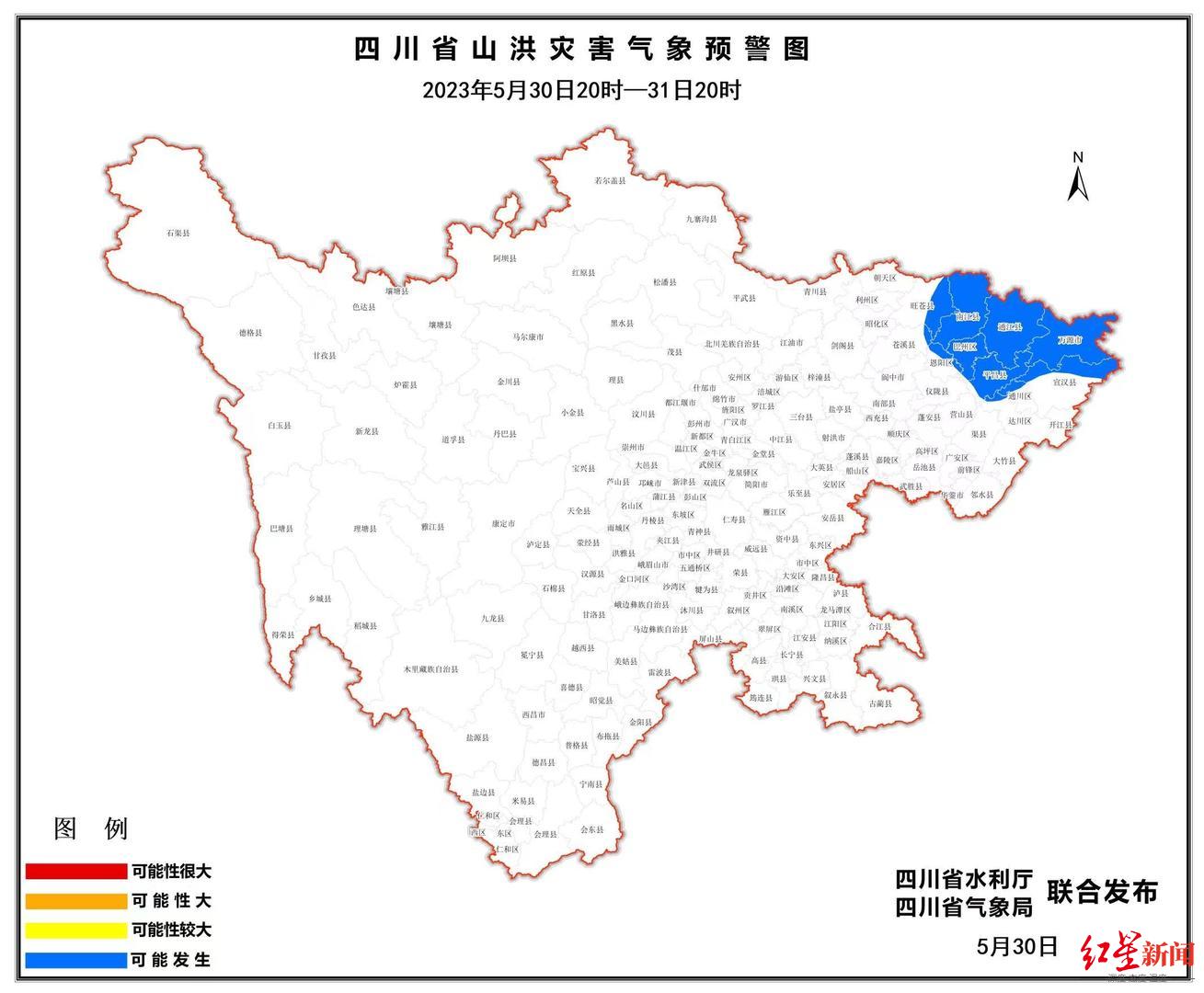 5月30日,四川省水利厅、四川省气象局联合发布了山洪灾害蓝色预警,5月30日20时至31日20时,南江、通江、平昌、巴州、恩阳、通川、达川、宣汉、万源、旺苍、苍溪等县(市、区)可能发生山洪灾害。