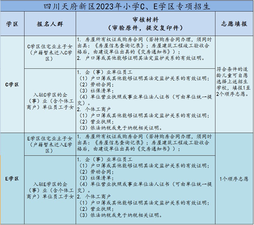 那么哪些人可以填报C、E学区的专项招生?根据公告信息,依旧是C、E学区住在业主子女,入驻相关学区的企(事)业单位员工以及个体工商户可填报。