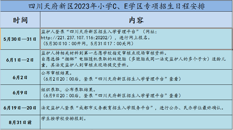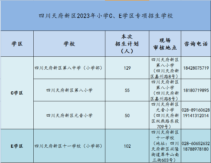 5月29日,四川天府新区发布了2023年小学C、E学区专项公告。根据相关公告,C、E学区共有4所学校参与专项招生,共计336个学位。具体如下: