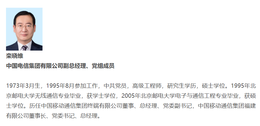 中国电信官网显示,中国电信集团新添一位副总经理,栾晓维获任中国电信集团有限公司副总经理、党组成员。