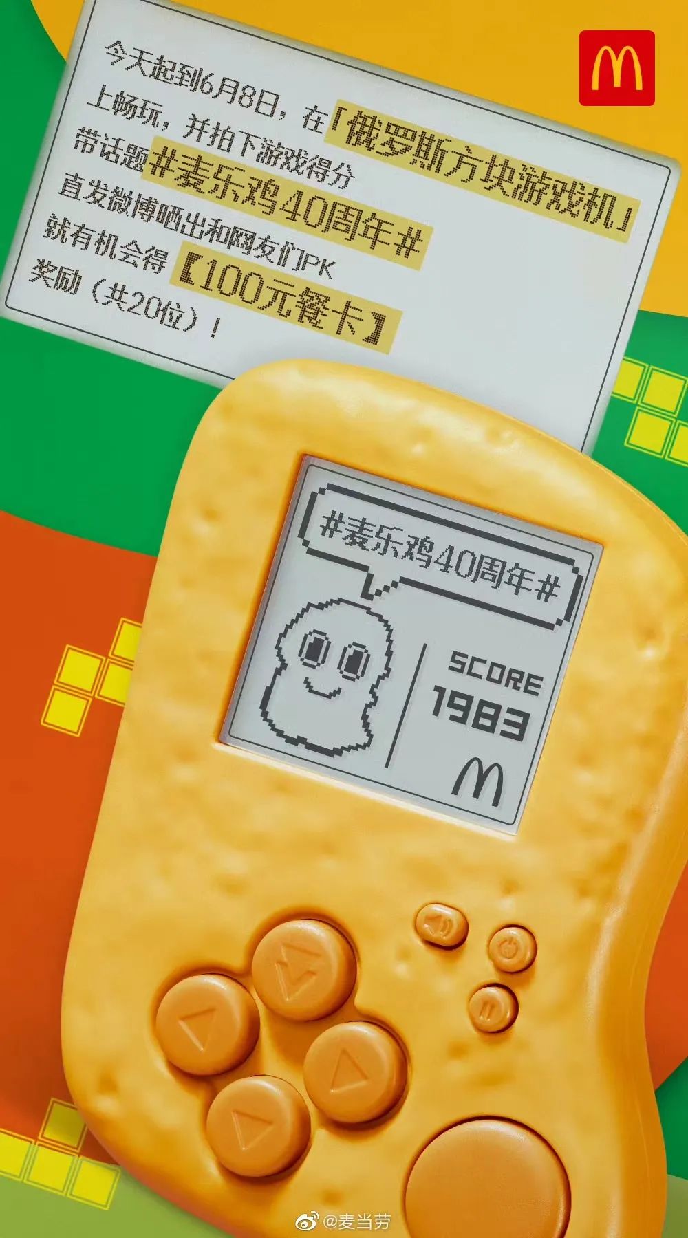 就在5月24日,为了庆祝麦乐鸡40周年,麦当劳推出了儿童节活动。消费者任意消费加30元即可兑换一台麦乐鸡块造型的俄罗斯方块游戏机。借助经典IP的「魔法」再次奏效,限量40万台的游戏掌机在发售当日就已售罄,在社交媒体以及线下门店再次掀起一股「吃麦当劳即是流行」的风潮。