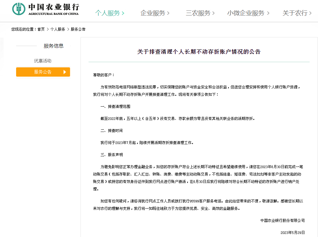 公告表示,2023年7月起,农业银行将陆续开展活期存折排查清理工作。为避免影响客户正常办理金融业务,如客户的存折账户符合上述长期不动特征且希望继续使用,需在2023年6月30日前完成一笔动账交易(包括存取款、汇入汇出、转账、消费、缴费等主动动账交易,不包括结息、短信费、司法扣划等非客户主动发起的动账交易)或持有效身份证件到农业银行网点进行账户激活,在6月30日后农业银行将陆续对符合长期不动特征的存折账户进行销户处理。