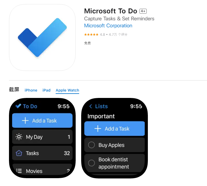 用户可以在 Apple Watch 上使用 Microsoft To Do 应用,在手表端查看、添加和完成任务。