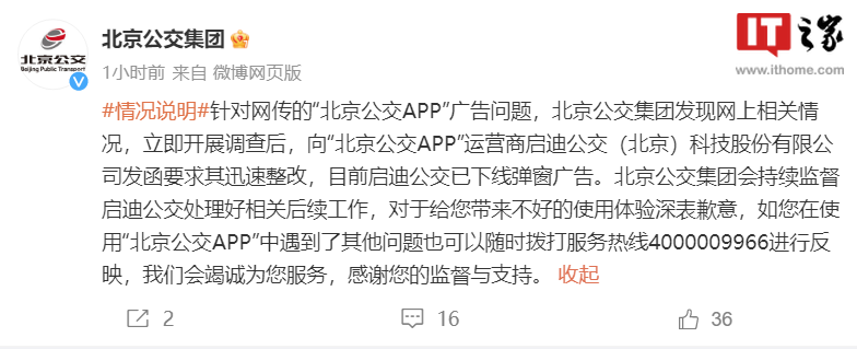IT之家 5 月 30 日消息,北京公交集团官方微博今天发布情况声明称,针对网传的“北京公交 App”广告问题,北京公交集团发现网上相关情况,立即开展调查后,向“北京公交 App”运营商启迪公交(北京)科技股份有限公司发函要求其迅速整改,目前启迪公交已下线弹窗广告。