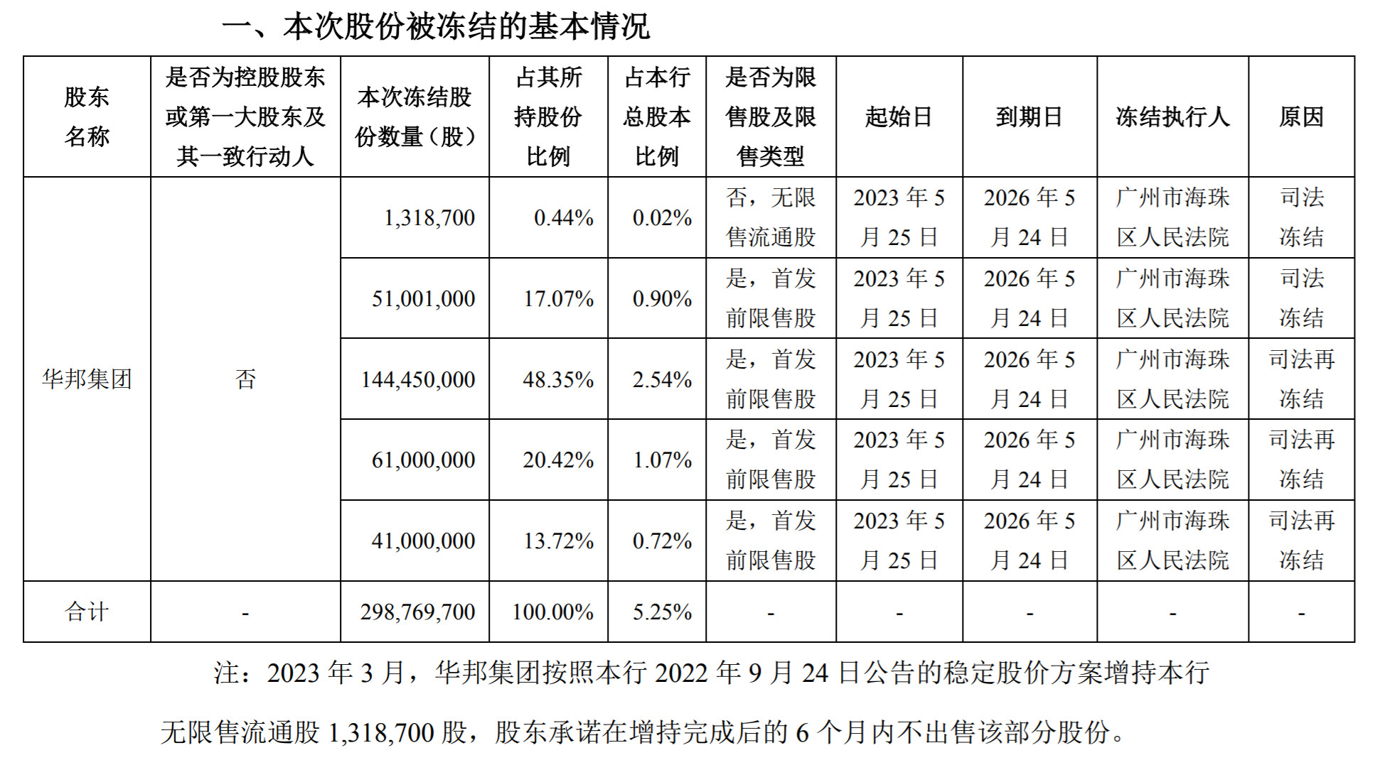 公告显示,华邦集团累计被冻结股份约2.99亿股,占该行总股本的5.25%,冻结起始日期为2023年5月25日,冻结结束日期为2026年5月24日。