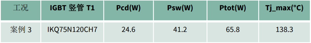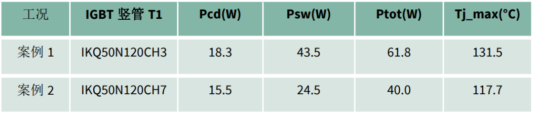 在相同工况下,H7单管的导通损耗略低于H3,开关损耗降低接近一半,较低的总损耗会使得散热器的温度降低。但H7芯片的面积比H3小,导致的较大热阻不利于结温的降低,尽管如此,H7单管的结温仍然比H3单管低13.8°C。也就是说,可以用H7单管代替之前设计中的同电流规格H3单管,并获得更高的结温裕量。