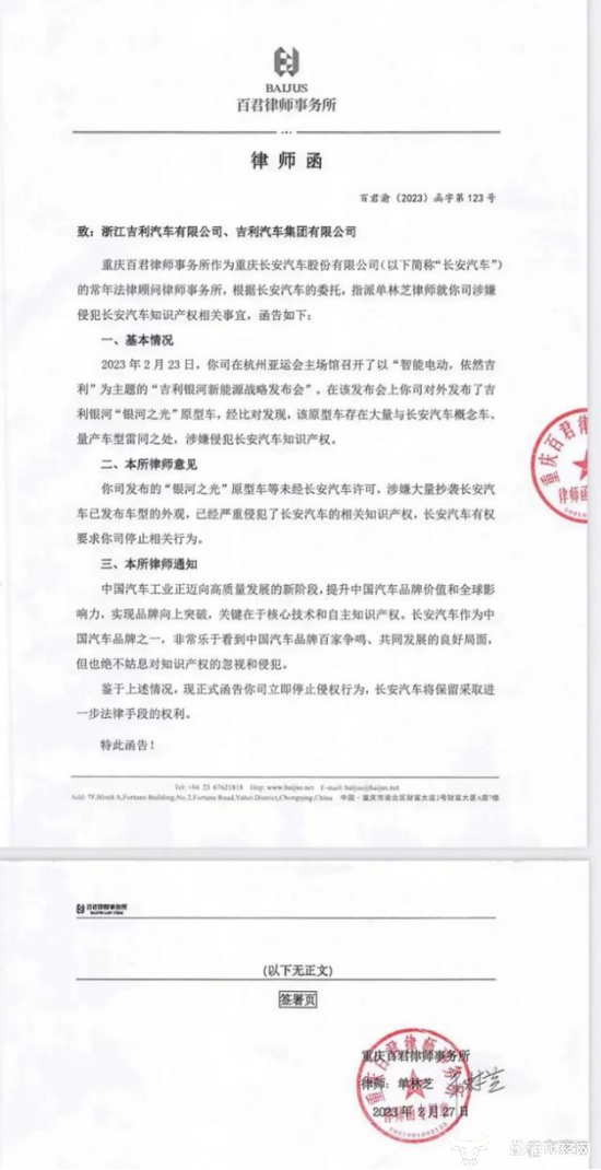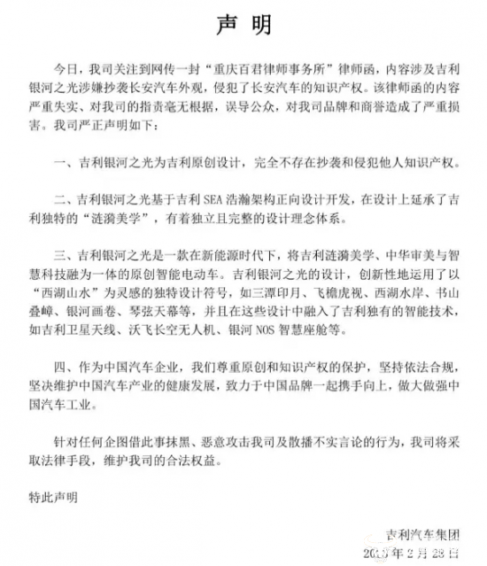 值得一提的是,吉利即将推出的首款插电混动车型银河L7的经历可谓也是“一波三折”,早在2023年2月23日,银河L7发布会后,吉利汽车就因“银河之光”原型车涉嫌大量抄袭长安汽车一车型收到律师函,对此,吉利汽车在官微发布声明表示,律师函内容严重失实。