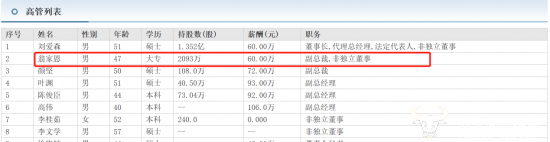 翁家恩和刘爱森的薪酬都不高,只有60万,公司其他高管比如副总裁颜坚,副总经理叶渊、陈俊臣、高伟等人的薪酬都比他们二人高一些。