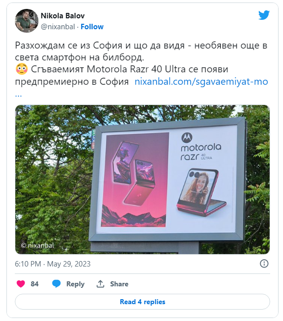 IT之家 5 月 30 日消息,网友尼古拉・巴洛夫(Nikola Balov)近日在保加利亚首都索非亚发现了一处户外广告,宣传摩托罗拉尚未宣布的 Moto Razr 40 Ultra 手机。