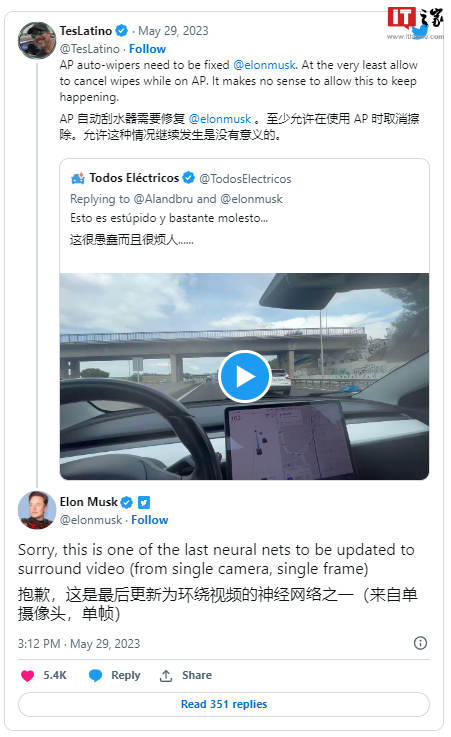 马斯克对这个请求做出了回应,并对该功能表现不佳表示了歉意。马斯克解释说,自动雨刷是最后一个升级到环绕视频(从单摄像头、单帧)的神经网络之一,所以未来的更新中应该会看到该功能的改进。