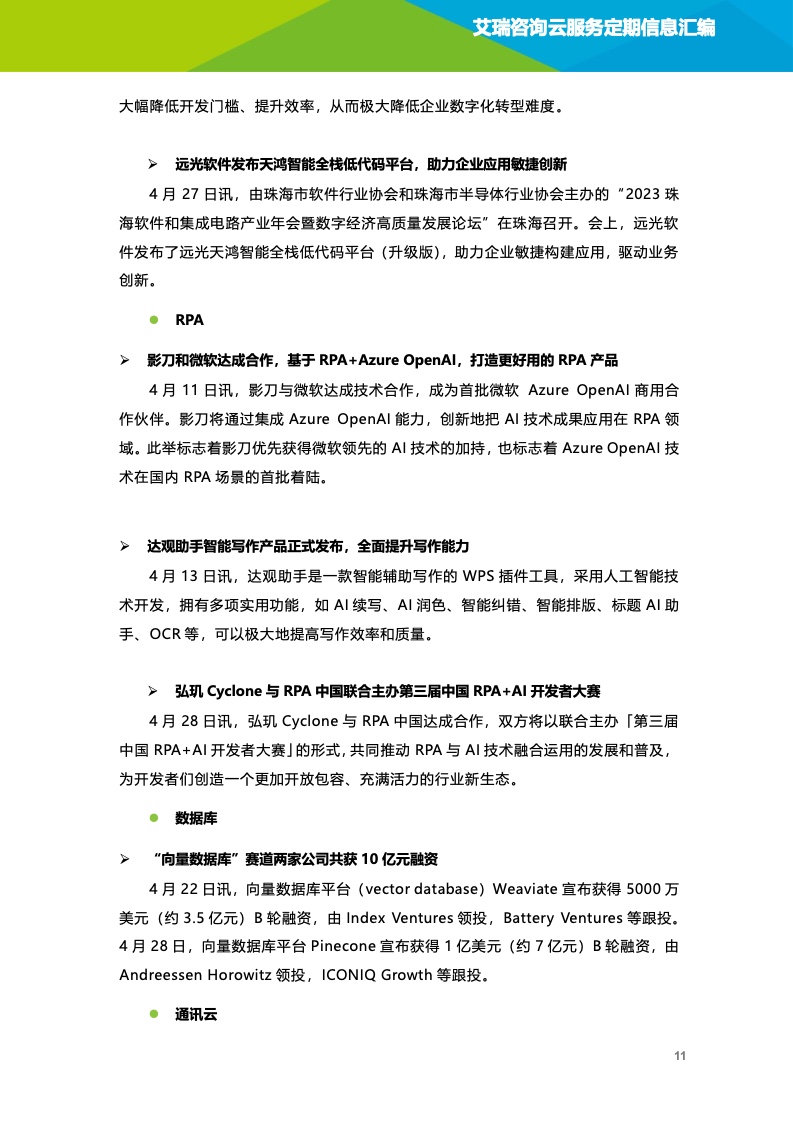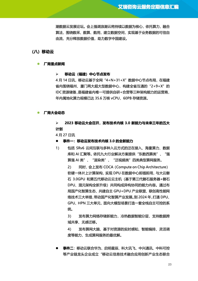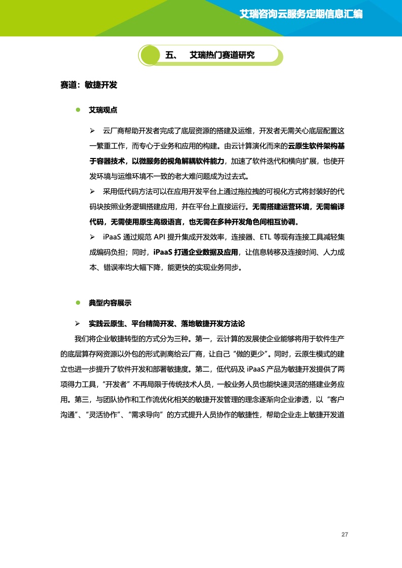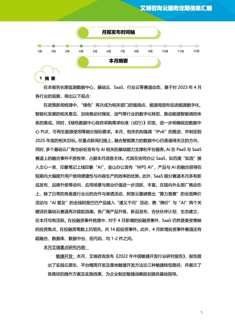 本月报是艾瑞针对整体云服务以及敏捷开发等热门赛道在本月产生的热门事件、政策动向、技术革新、招采信息、资本动态等,及重点客户和头部企业的动态信号及标杆案例,进行材料搜集并整理的行业信息监测报告。