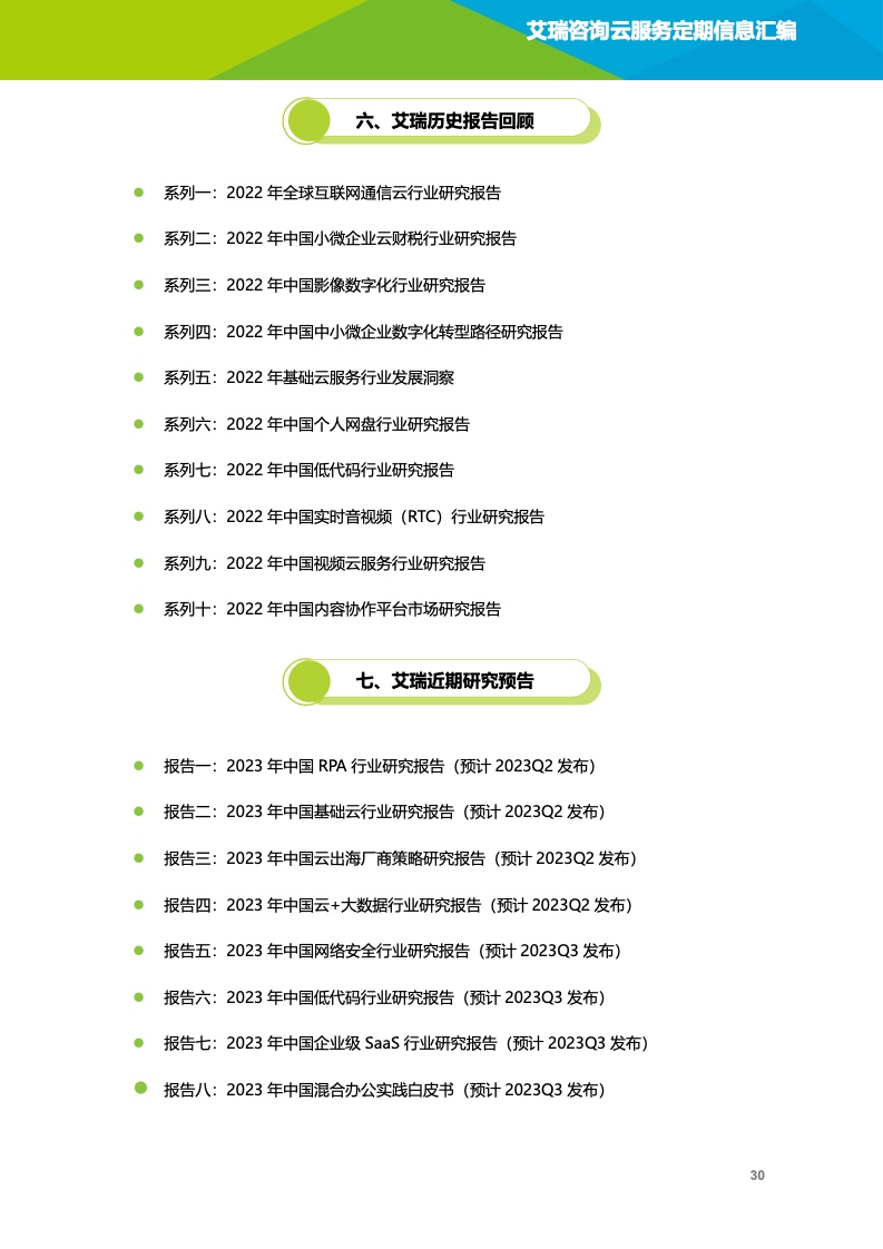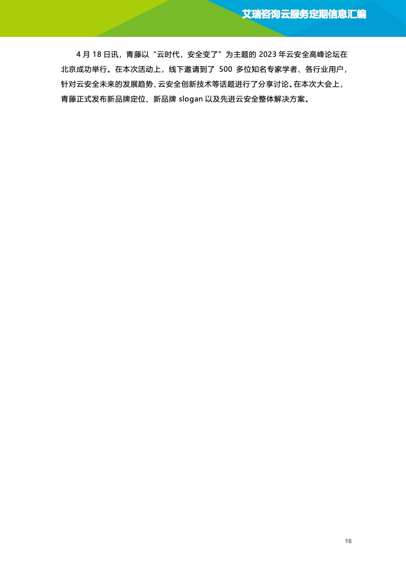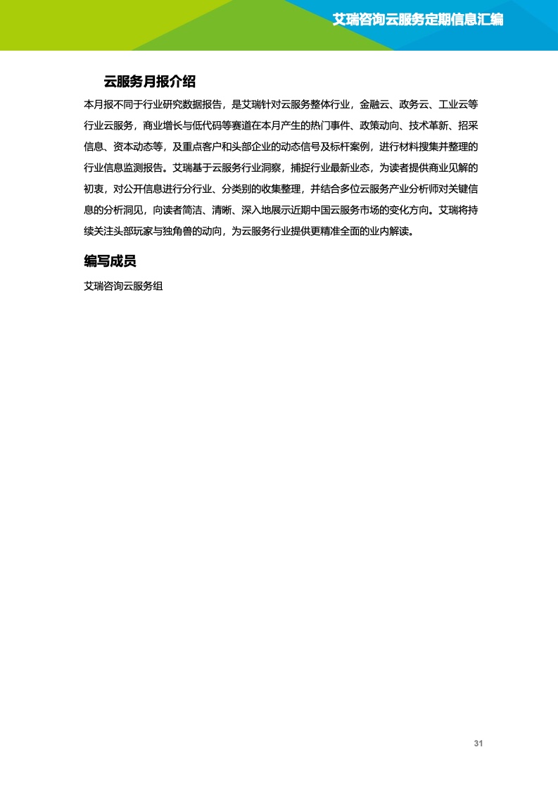 艾瑞基于云服务行业洞察,捕捉行业最新业态,为读者提供商业见解的初衷,对公开信息进行分行业、分类别的收集整理,并结合多位云服务产业分析师对关键信息的分析洞见,向读者简洁、清晰、深入地展示近期中国云服务市场的变化方向。