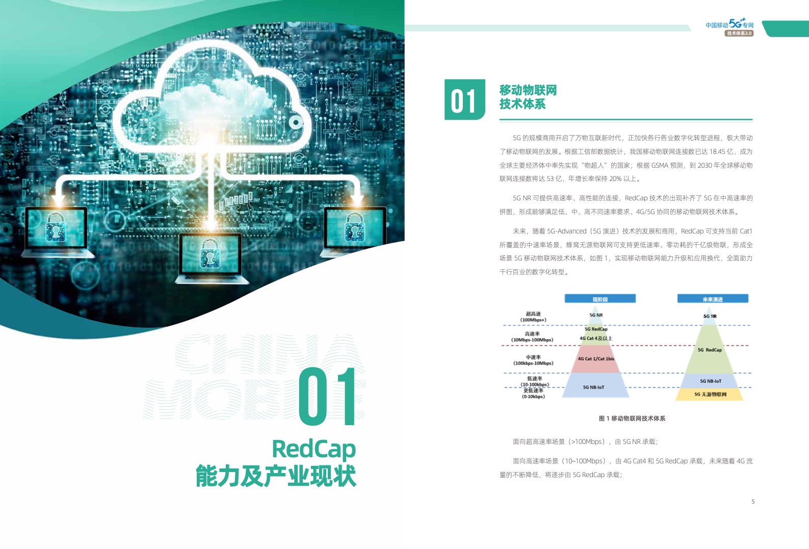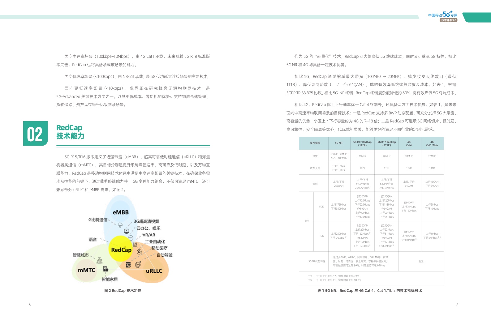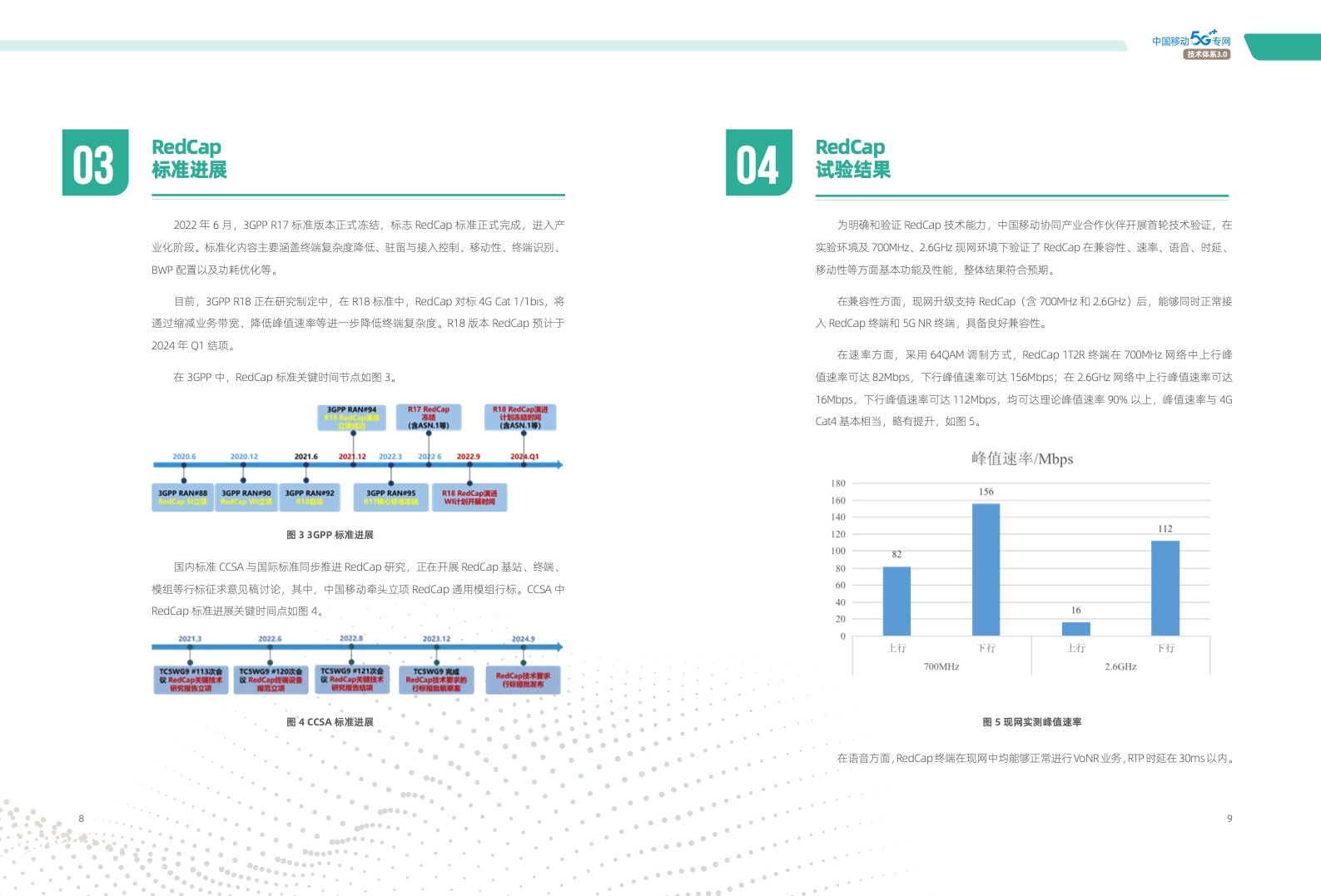 在能力及产业现状方面,白皮书指出RedCap面向中高速率业务,补齐了5G移动物联网技术体系。白皮书基于理论分析和实测数据,给出了RedCap的速率、时延等典型性能,并对标准进展、网络设备、芯片、模组/终端产业现状进行了详细介绍。