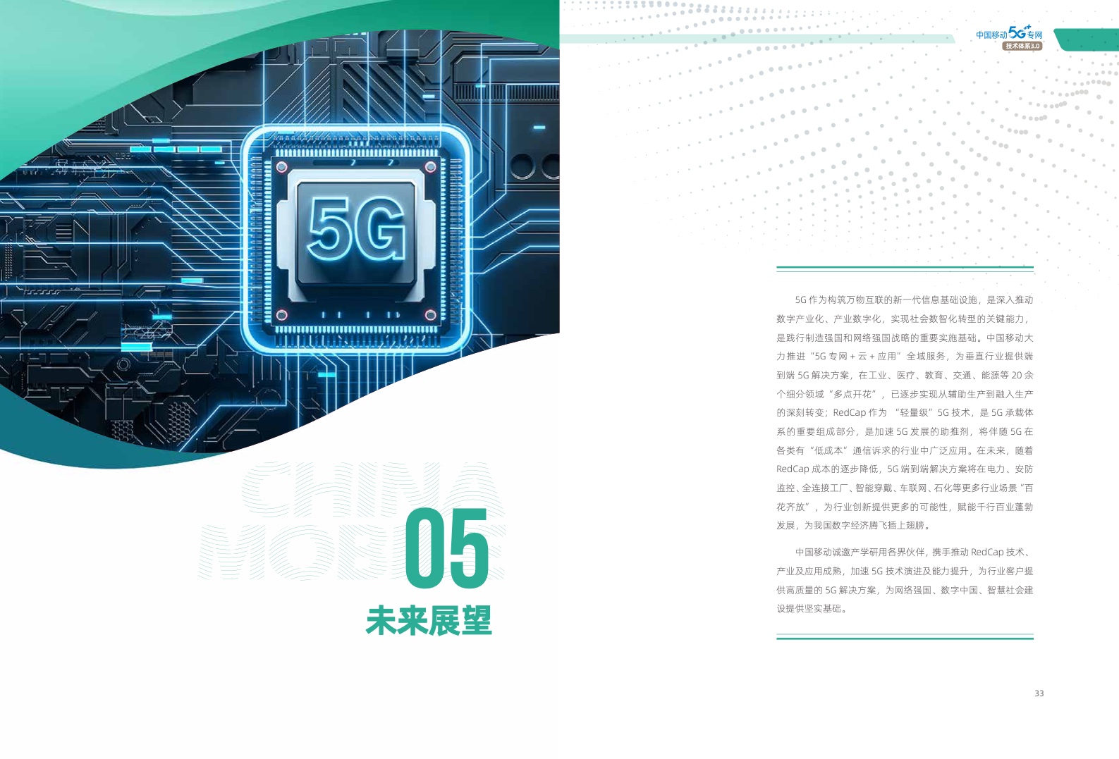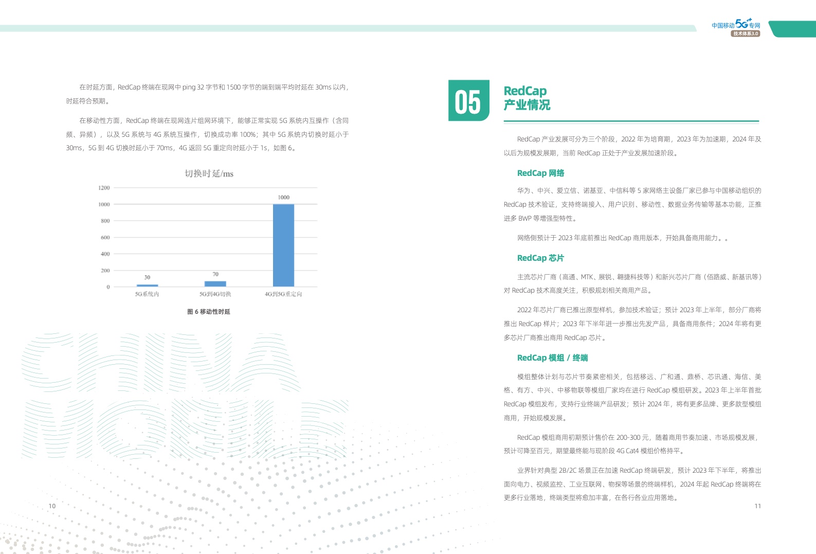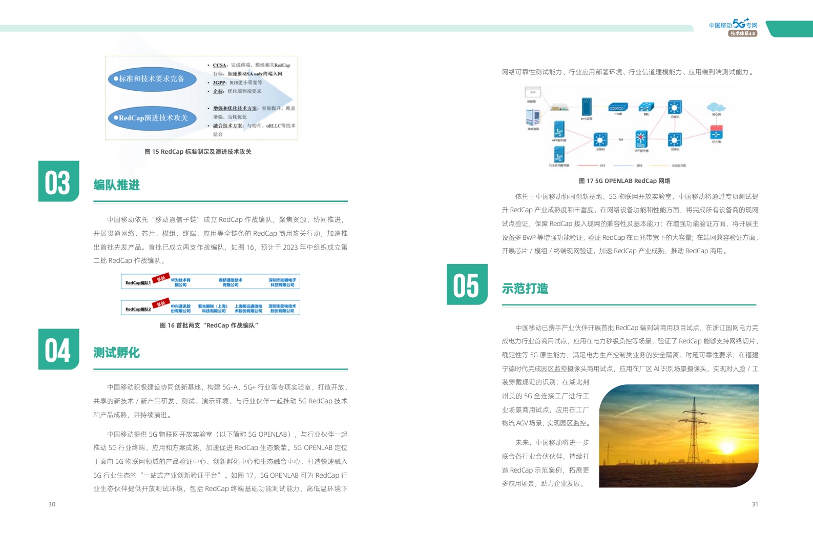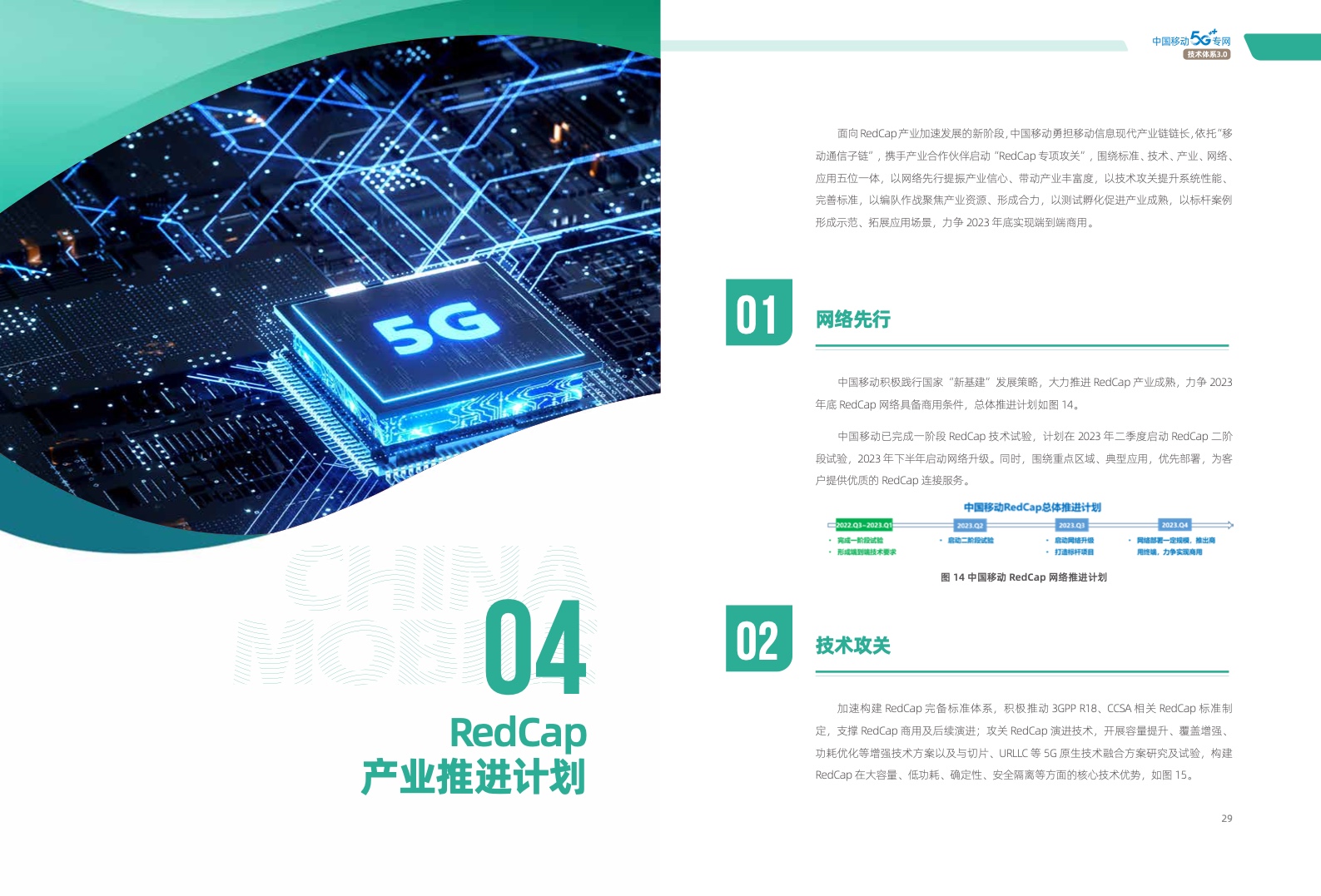 在产业推进方面,白皮书明确了中国移动力争2023年底RedCap端到端商用的推进目标,并介绍了网络先行、技术攻关、编队作战、测试孵化、示范打造五方面的具体举措和进展。