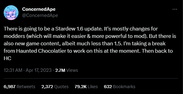 游戏发布至今已有7年之久,其开发者Eric Barone现阶段一边开发新游戏Haunted Chocolatie,一边继续维持着游戏的缓慢更新。一个多月前,Eric Barone在自己的广受玩家瞩目的个人账号上公布称,自己将暂时停止新游戏的开发,转而将精力放在《星露谷物语》的1.6版本更新上。