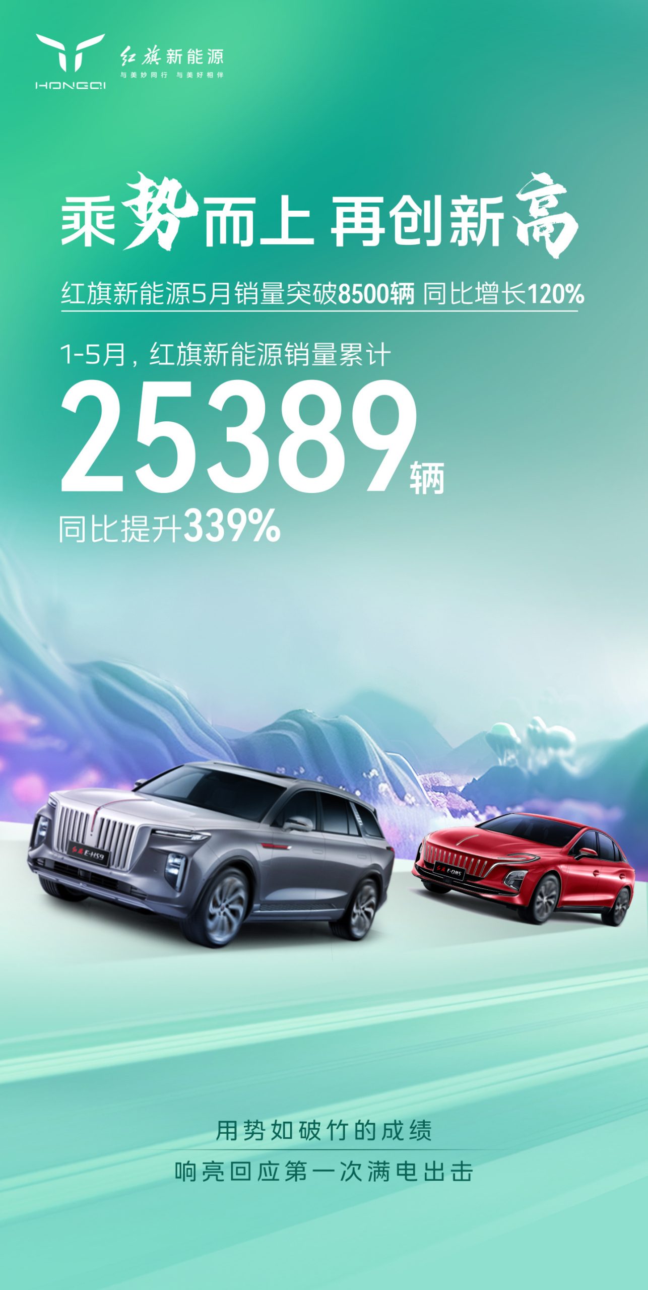 近日消息,中国一汽今日发布了最新数据:5 月红旗新能源销量超 8500 辆,同比增长 120%;1-5 月销量累计 25389 辆,同比增长 339%。
