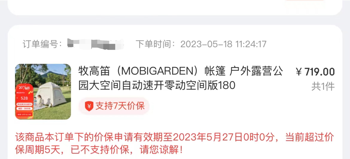 据消费者提供的购买图片显示,该商品“支持7天价保”,底部显示:“该商品本订单下的价保申请有效期至2023年5月27日0时0分,当前超过保价周期5天,已不支持价保,请您谅解!”