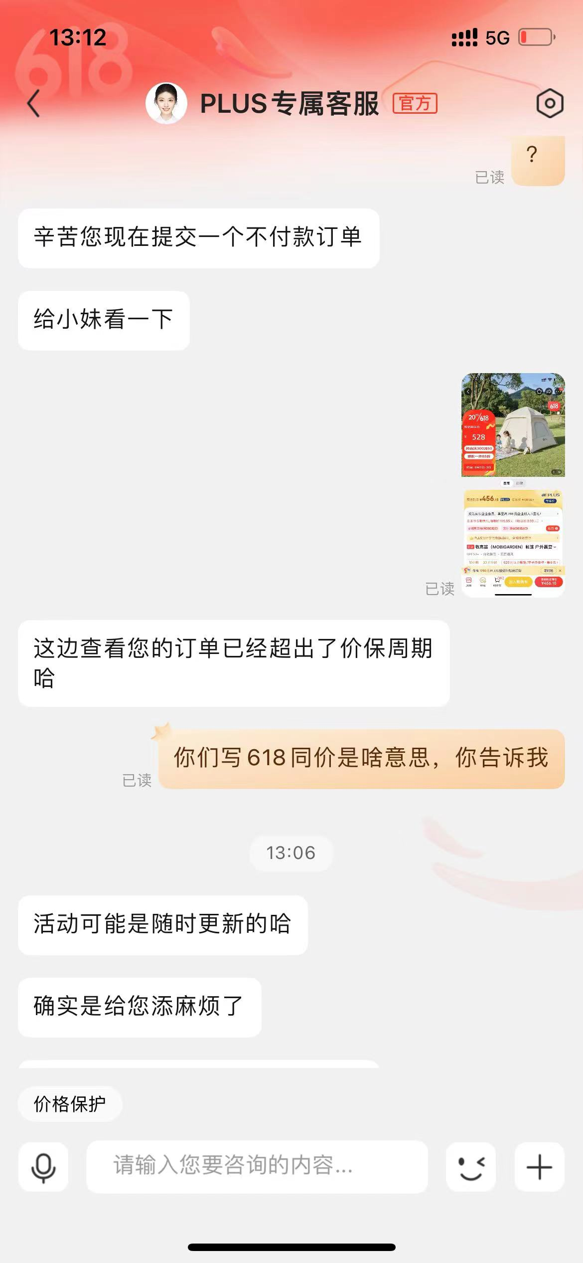 据上述消费者表述,5月18日,他在京东上以575元的价格购买了一顶帐篷,当时宣传页面显示“618同价”。近日,该名消费者发现帐篷降价为456元,于是找到客服进行反馈。