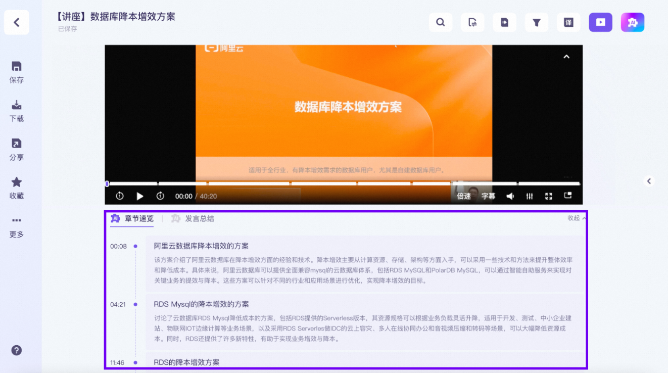 通义听悟可自动为音视频生成全文摘要、章节概括、发言总结