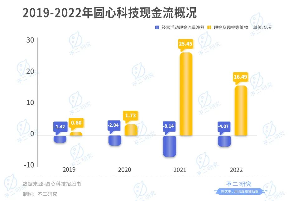 此外,2019-2022年,圆心科技录得经营现金流出净额1.42亿元、2.04亿元、8.14亿元、6.40亿元;其在风险因素中坦承,主要由于不断加大院外综合患者服务的市场推广力度,导致销售及市场推广开支相应增加。
