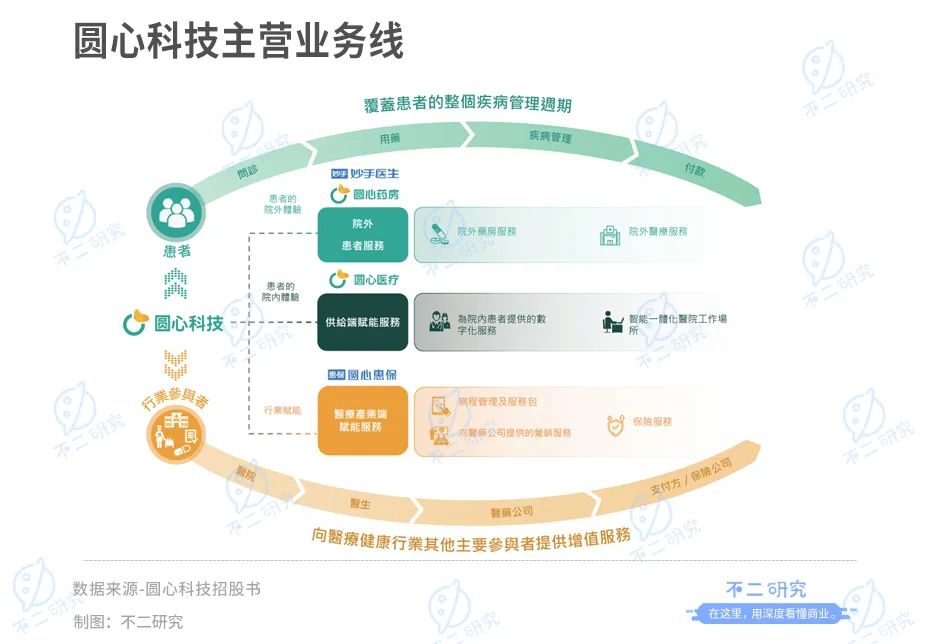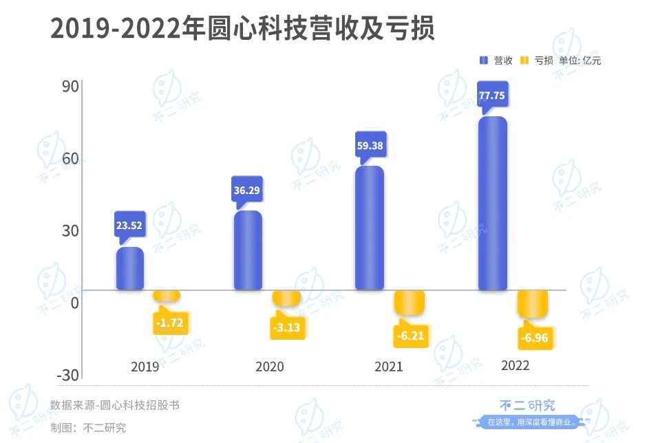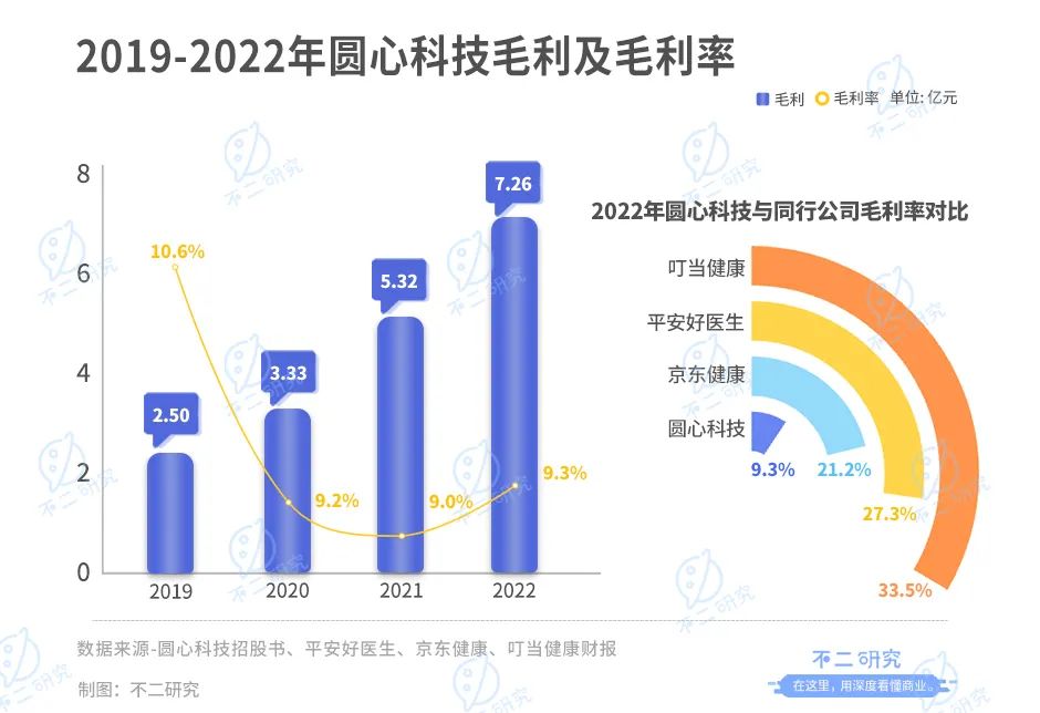 互联网医疗下半场,圆心科技四闯IPO!5月29日,互联网医疗行业的“独角兽”北京圆心科技集团股份有限公司(下称“圆心科技”)再次递交招股书,继续向港交所发起上市冲击。此前,圆心科技曾三次递交招股书,这是继其于2021年10月15日、2022年4月19日、2022年10月21日招股书失效之后的再一次申请。圆心科技是一家提供专注于患者的医疗服务周期的服务的医疗健康公司。在新版招股书援引弗若斯特沙利文资料,以2022年收入计,圆心科技在中国处方药的线下线上医疗交付平台排名第一。「不二研究」据圆心科技新版招股书中发现:2022年,其营收为77.75亿元,同比增加30.94%;同期,经调整后的净亏损为6.96亿元,同比扩大12.01%。在2019-2022年,圆心科技四年累计营收196.94亿元,其院外综合患者服务的收入为187.38亿元,仍未摆脱单一的盈利模式。以2022年为例,来自药品销售收入为72.83亿元,当期营收占比高达93.7%。与此同时,圆心科技难逃增收不增利“怪圈”,其四年累亏超18亿元;其中,2020-2022年圆心科技的亏损率由8.6%上升到10.4%。去年10月的一篇旧文(《互联网医疗下半场,圆心科技三战IPO》)中,我们聚焦于互联网医疗行业的“独角兽”圆心科技三闯IPO,尽管搭乘“互联网+”东风,但其亏损不断扩大;且毛利率与研发费率偏低。时至今日,随着互联网医疗赛道竞争逐渐加剧,圆心科技再战港股,其能否借IPO讲出新故事?由此,「不二研究」更新了10月旧文的部分数据和图表,以下Enjoy:根据新版招股书定位,圆心科技为一家提供全周期医疗健康服务的公司。招股书显示,2022年营收高达77.75亿元,但在2019-2022四年累计亏损达21.26亿元,经调整后的净亏损也累亏超18亿元。在「不二研究」看来,搭乘“互联网+”东风,圆心科技的营收规模迅速扩大,亏损额度也在拉大;作为互联网医疗行业的“独角兽”,其超过9成营收来自药品销售,科技成色不足。疫情影响下,医疗版权出圈,但互联网医疗的竞争也在加剧。圆心科技能否圆梦IPO尚存变数;即使成功推开IPO大门,它也需要直面下半场的激烈竞争与资本市场的未知考验。持续亏损,毛利率低于同业圆心科技创立于2015年,这一年正是中国互联网医疗的创业风口。彼时,微医、春雨医生等纷纷布局互联网医疗赛道,圆心科技也在同年推出主营线上问诊业务的“妙手医生”平台。创业至今,圆心科技主要有三条业务线,即:院外综合患者服务,旗下拥有“妙手医生” “圆心药房”两个平台;供给端赋能服务,对应“圆心医疗”;创新医疗健康服务,主要包括“圆心惠保”等。