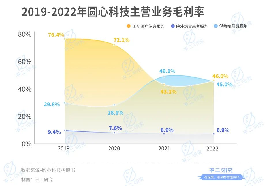 仅以2022年为例,来自供给端赋能服务、创新医疗健康服务的两项业务,在整体营收的合计占比仅为6.3%。在「不二研究」看来,圆心科技依赖院外综合患者服务“一条腿走路”,固然在创业初期享受到快速占领市场等红利,但这也是拖累其整体毛利率的主要原因之一。2019-2022年,院外综合患者服务的毛利率为9.4%、7.6%、6.9%、6.9%。圆心科技在招股书中解释称,这主要由于药品成本相对较高,且医药供应商的生产能力受疫情影响所致。硬币的另一面,营收占比低的两项业务却拥有较高毛利率。2019-2022年,供给端赋能服务的毛利率分别为29.8%、28.1%、49.1%、45.0%;同期,创新医疗健康服务的毛利率高达76.4%、72.1%、43.1%、46.0%。