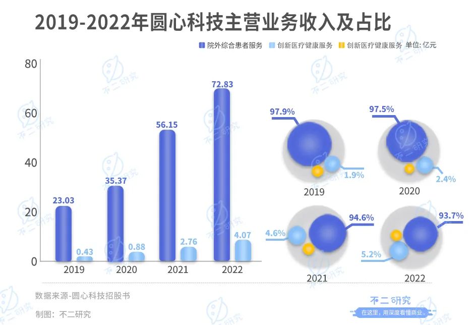 在「不二研究」看来,作为互联网医疗行业的“独角兽”,尽管圆心科技已是资本宠儿,却依然难逃经营持续亏损;从经营数据来看,主要由于低毛利率叠加高销售费率所致。当互联网医疗赛道竞争加剧,圆心科技选择四次闯关IPO;其未来造血能力及盈利时间表,或是说服资本市场的一大关键。卖药为生,科技成色不足尽管圆心科技的三大业务看似形成“药-医-险”闭环;但从业绩数据而言,其院外综合患者服务(即:药品销售)撑起超9成营收,它也因此被业内戏称“卖药为生”。如果拆解收入构成,2019-2022年,来自院外综合患者服务的营收为23.03亿元、35.37亿元、56.15亿元、72.83亿元,同期营收占比高达97.9%、97.5%、94.6%、93.7%,在收入中占绝对主力。同期,来自供给端赋能服务的营收仅为576.3万元、379.5万元、4718万元、8549.6万元,当期营收占比仅为0.2%、0.1%、0.8%以及1.1%;来自创新医疗健康服务的营收为4343.8万元、8847.1万元、2.76亿元、4.07亿元,当期营收占比1.9%、2.4%、4.6%、5.2%。