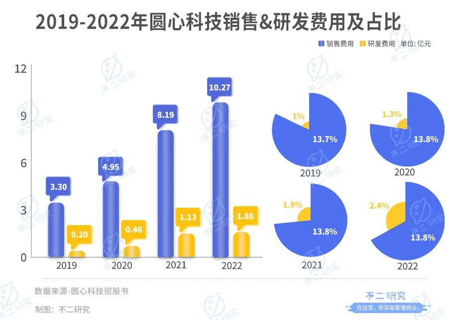 由于两者的整体营收占比不足7%,并不能撬动整体毛利率大幅提升。目前,圆心科技的主要营收来源为药品销售。「不二研究」认为,这看似找到可以突围的盈利模式,但由于药品是标类商品,附加服务值不高,叠加供应端影响,实则毛利率较低。且同业间竞争激烈,药品的销售量往往考验营销能力。烧钱“跑马圈地”之下,圆心科技的销售费用高企,2019-2022年分别为3.3亿元、5.0亿元、8.2亿元、10.3亿元,销售费率达13.8%、13.7%、13.8%、13.2%。且其预计,未来将扩大线下药房及实施新的业务举措,销售费用会维持增长。与之形成鲜明对比的是,2019-2022年,其研发开支为2265.1万、4629.4万、1.13亿、1.88亿,研发费率仅为1%、1.3%、1.9%、2.4%。