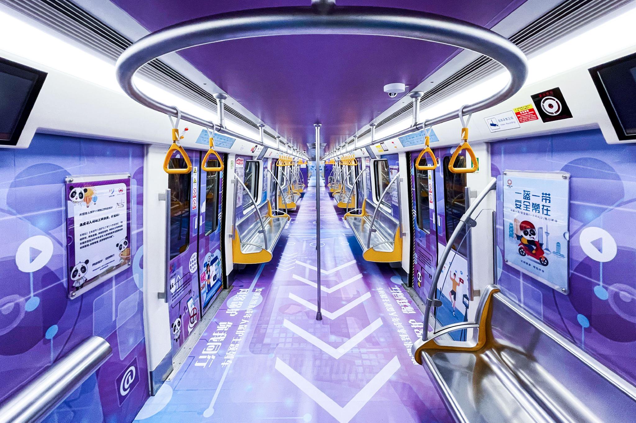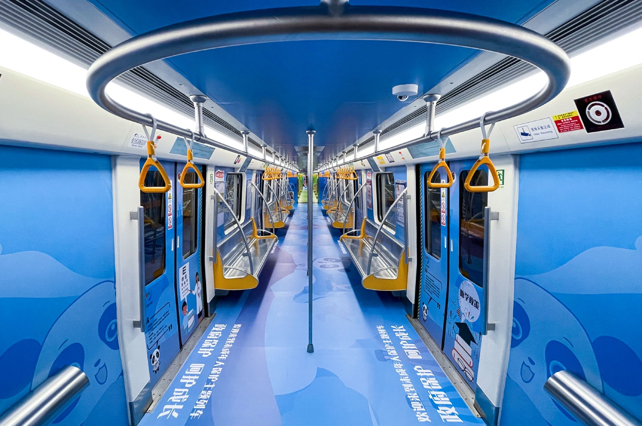 粉色系、蓝色系、绿色系、紫色系……多变的车厢色彩如同儿童心中五彩斑斓的世界,美好而新奇;蓝天、白云、游乐场、艺术馆……缤纷的设计元素构成一幅幅生动活泼的图画。同时,未保小卫士IP形象——蜀保保、蜀未未更是化身此次“未成年人保护号”主题列车的普法讲解员,通过灵动、活力的互动设计带领乘客共同学习《未成年人保护法》的相关内容。