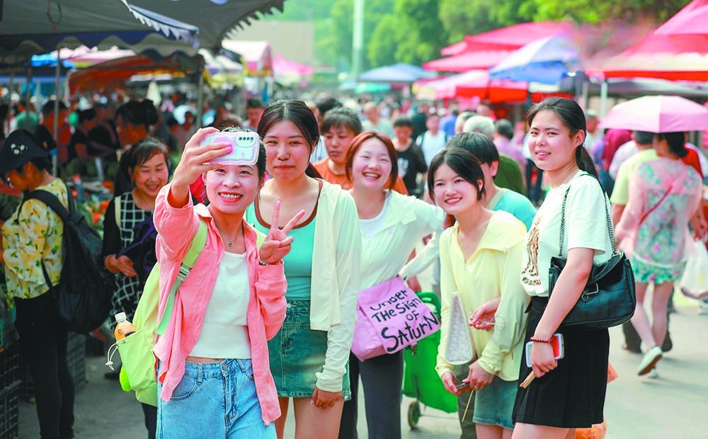 ▲谁能拒绝儿时的赶场回忆?谁又能拒绝这满街的烟火气?于是,打卡的年轻人来了。李雪萍(左二)被香喷喷的酱香饼勾起馋虫。曾梨红(左三)告诉记者,赶场和逛超市的乐趣完全不一样,又让她想起儿时赶场的时光。