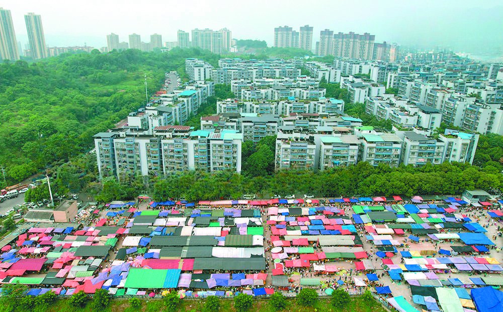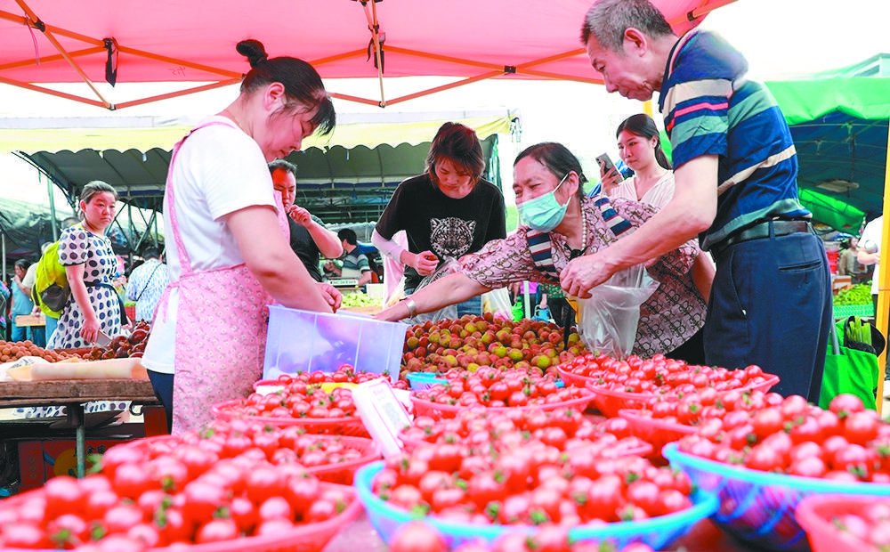 ◀年过七旬的沈爷爷(右一),早上8点过就来赶场,小推车里塞满了蔬菜,还想再挑选点水果。在他看来,这些蔬菜水果新鲜又实惠,一早倒两趟公交来逛,值! 据华龙网