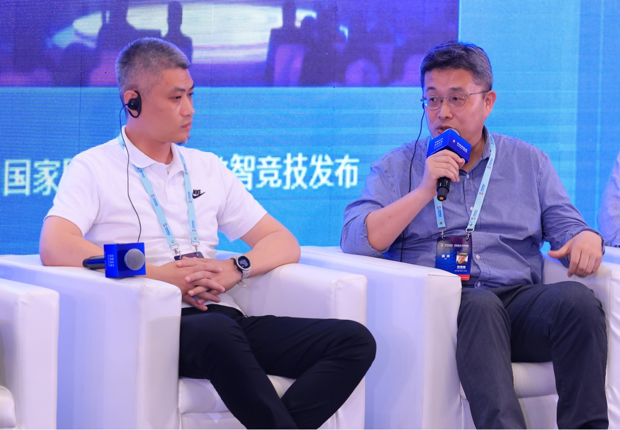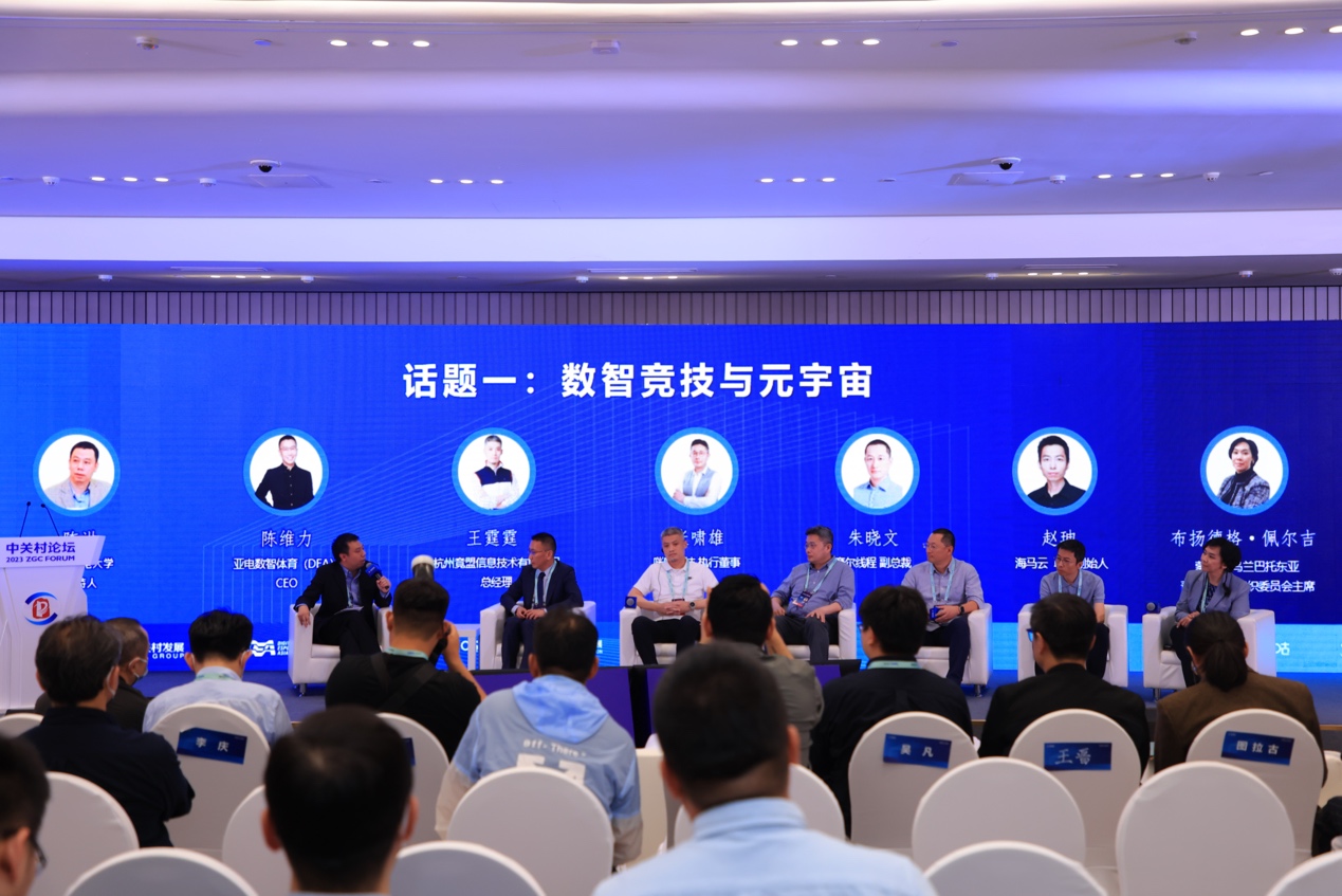 圆桌对话环节分为两个话题,分别是"数智竞技与元宇宙"和"数字体育演进的未来图景"。北京邮电大学交互技术与体验系统实验室副主任陈洪、亚电数智体育CEO陈维力、竟盟公司总经理王霆霆、咪嗒科技执行董事张啸雄、摩尔线程副总裁朱晓文、海马云联合创始人兼副总裁赵珅以及东亚青年运动会组委会的执行总监Buyandelger Peljee共同参与了第一个圆桌的对话。