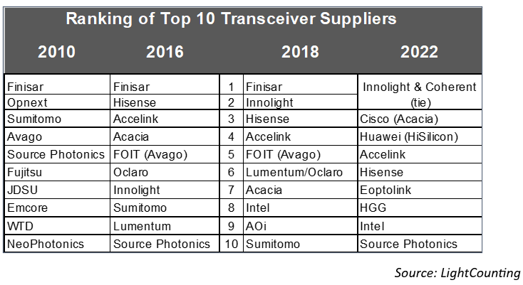 2022年,旭创科技(排名并列第1)、华为(排名第4)、光迅科技(排名第5)、海信宽带(排名第6)、新易盛(排名第7)、华工正源(排名第8)、索尔思光电(排名第10)入围。值得一提的是,索尔思光电被中国公司收购,故本期已是中国光模块厂商。