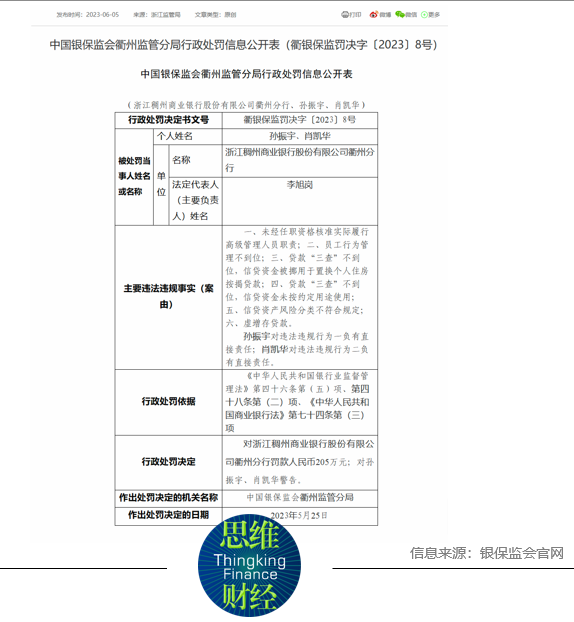 6月5日,银保监会衢州监管分局指出,鉴于浙江稠州商业银行衢州分行存在6项违规违法行为,对其给予205万元罚款,并对相关责任作出警告处罚。