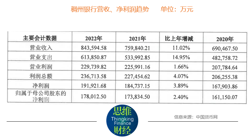 稠州银行发布的2022年度报告显示,该行在营业收入同比增长10.05%至84.36亿元的情况下,归母净利润仅同比增长2.4%。