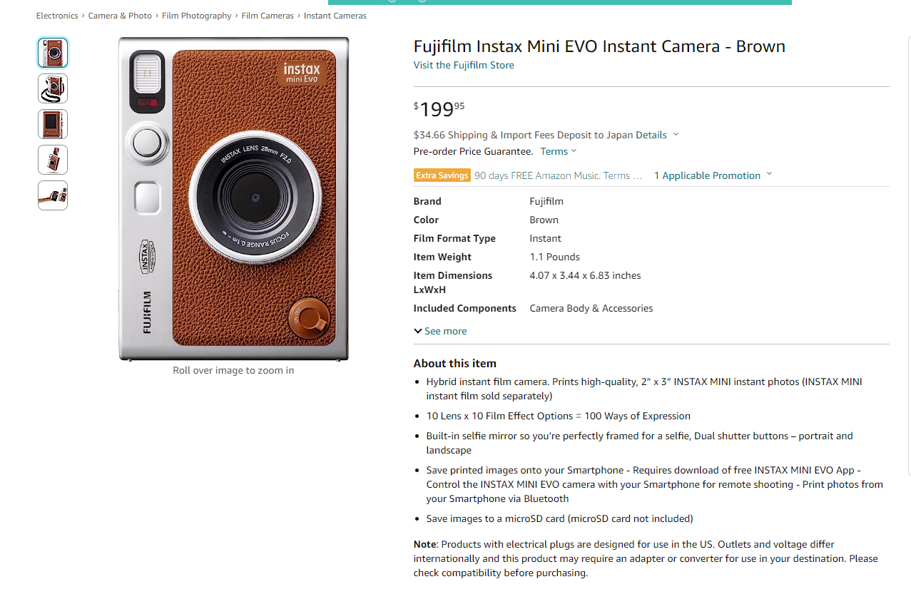此外,还有IT之家用户发现富士 Instax Mini EVO 棕色版已在亚马逊上架并开启预购,定价 199.95 美元(IT之家备注:当前约 1432 元人民币),即将正式发布。