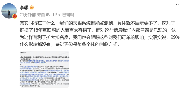 李想发博称:“其实同行在干什么,我们的天眼系统都能监测到,具体就不展示更多了,这对于一群搞了18年互联网的人而言太容易了。面对这些信息我们内部普遍是乐观的,认为这样有利于扩大知名度。我们也会跟踪这些对我们订单的影响,实话实说,99%什么影响都没有,感觉更像是某些个体的创收方式。”